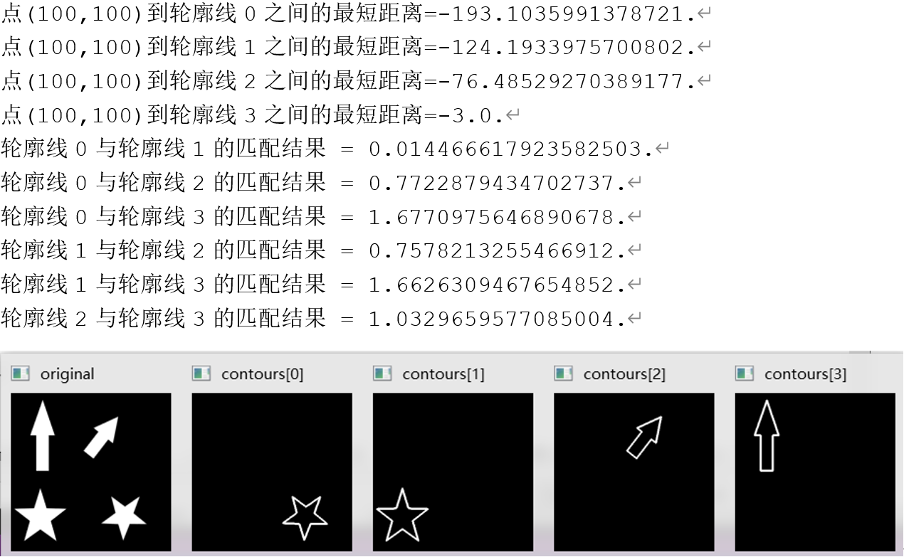 print(f"点(100,100)到轮廓线{i}之间的最短距离={retval}.")