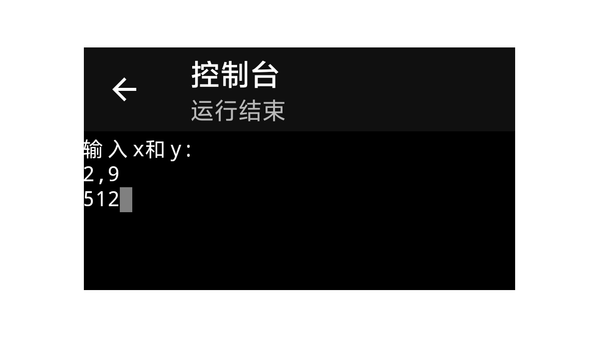 C语言[求x的y次方] 这段 C 代码的目的是从用户输入获取两个整数 x 和 y ,然后计算 x 的 y 次幂(不过这里有个小错误,实际计算的是 x 的 (y - 1) 次幂,后面会详细说),最后输出结果。当我们想求2的9次方时,给x赋值2,给y赋值9,得出结果512。printf("输入x和y:");
