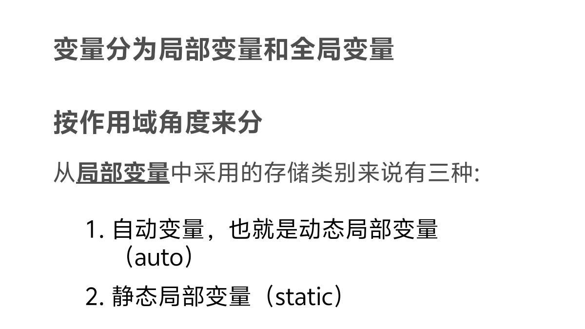 关于C语言——对一个数据定义的两种属性 autostaticregisterextern 平时使用的时候一般不标明存储类型,而存储类型主动是为auto,自动变量,在函数内去定义。 如果定义一个数据它为静态局部或外部整形变量那就是: static int a;从局部变量中采用的存储类别来说有三种:从全局变量中采用的存储类别来说分为两种。从动态存储中采用的存储类别来说有三种:从静态存储中采用的存储类别来说分为三种。从局部变量中采用的存储类别来说有三种:从内存中动态存储区: 自动变量和形式参数从CPU中的寄存器:寄存器