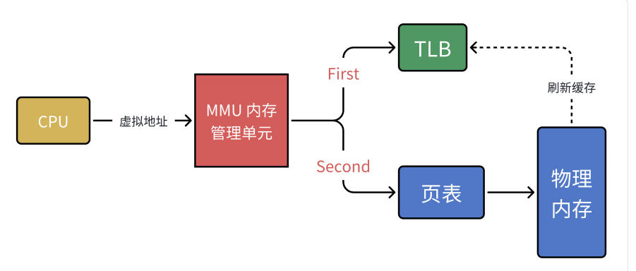 那么为了解决这个问题,就引入了TLB,俗称快表,访问过的映射关系会被存到TLB里,去访问虚拟地址的时候会先查TLB缓存看有没有,没有再去查页表拿到具体的物理地址。