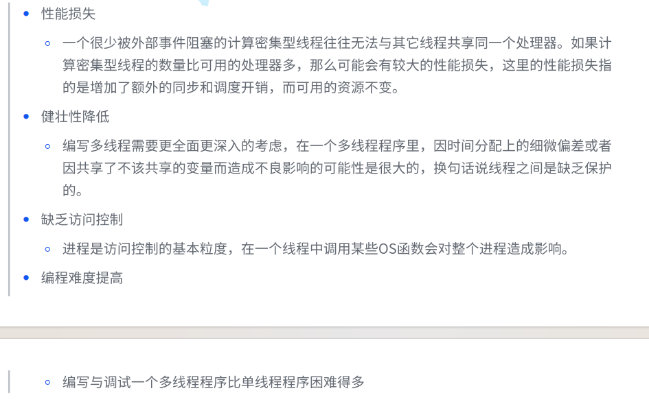 但是线程也有缺点,比如计算密集型的线程被切换会损失较多的性能,健壮性降低,当多个线程访问一个共享资源的时候需要加锁访问,缺乏访问控制,线程由于共享地址空间,所以线程可以很容易的修改其它线程的堆,可能会导致不安全的行为。