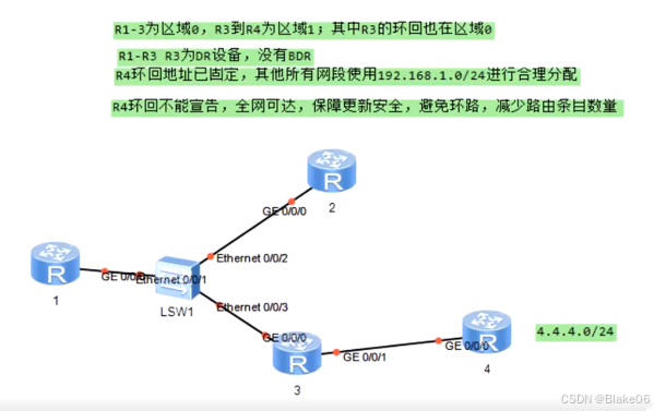 OSPF作业 R1-3为区域0,R3-R4为区域1;其中R3的环回也在区域0R1-R3 R3为DR设备,没有BDRR4环回地址已经固定,其他所有网段使用192.168.1.0/24进行合理分配R4环回不能宣告,全网可达,保障更新安全,避免环路,减少路由条数目。