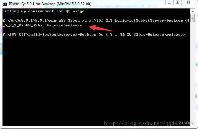 输入“cd /d F:\IOT_GIT\build-IotSocketServer-Desktop_Qt_5_9_1_MinGW_32bit-Release\release”转到项目的位置。