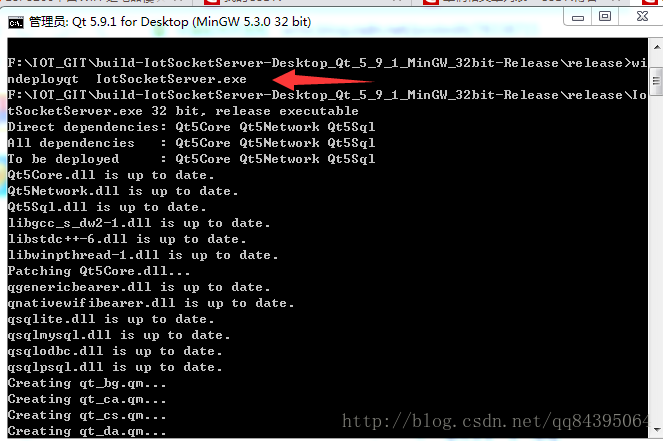 4.使用QT自带windep功能将自动建立该项目所需要的一些库文件输入“windeployqt IotSocketServer.exe”这里的“IotSocketServer”代表你程序的文件名字。