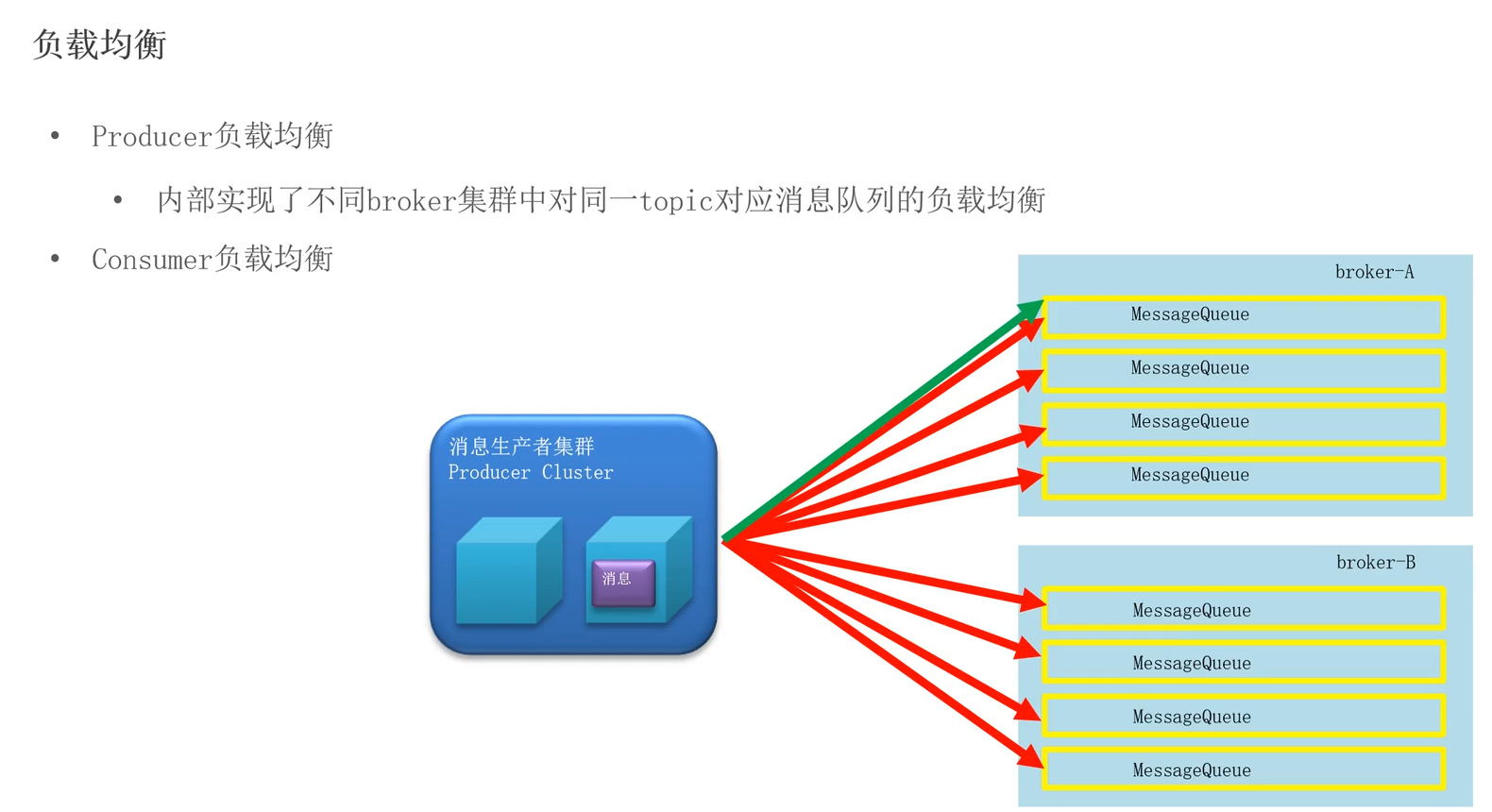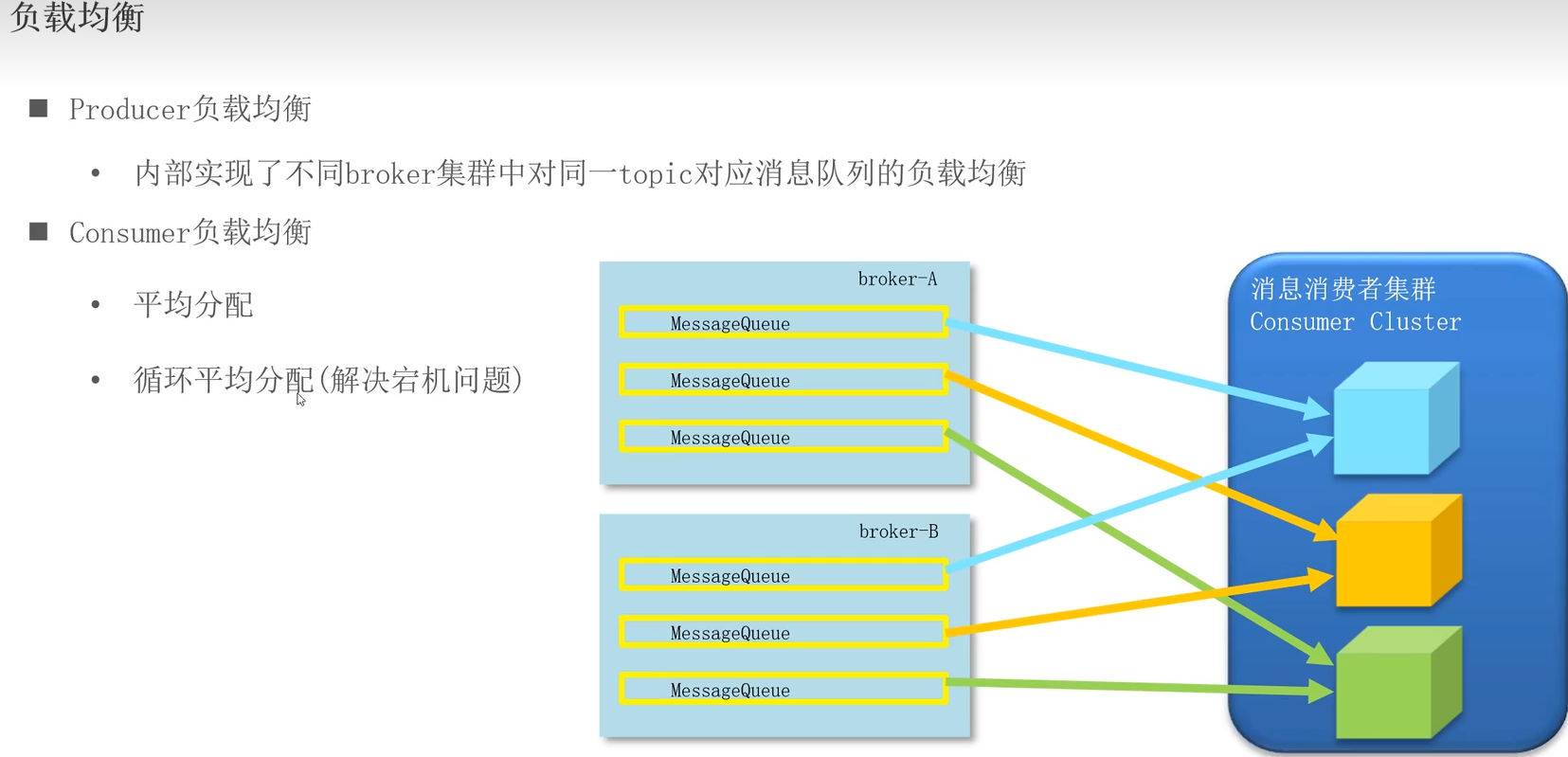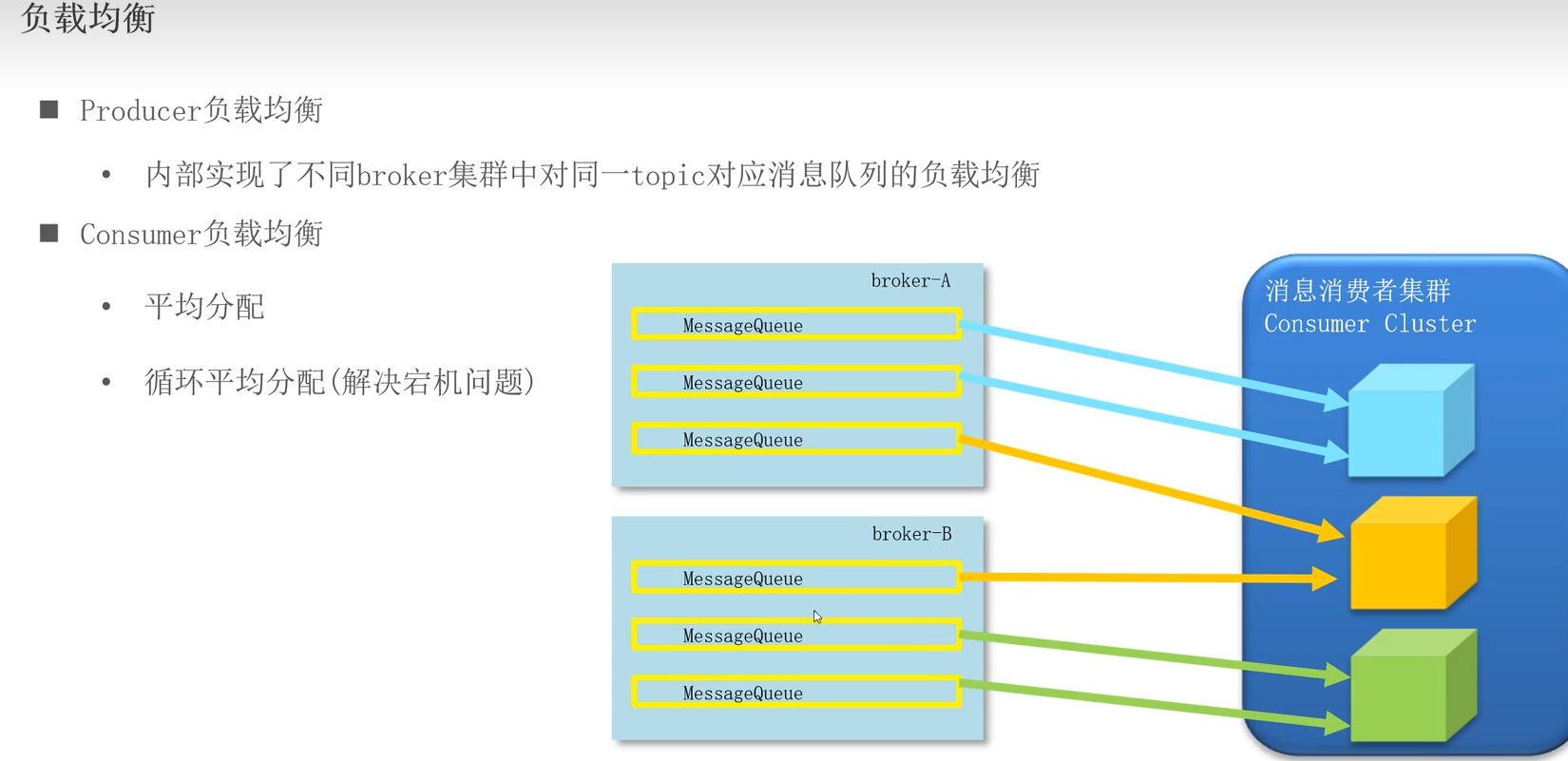 对于消费者端,同样存在负载均衡,尽可能要让同一个broker都能指向消费者集群的不同消费者,为了在某个broker挂掉之后,还能够正确发送给消费者。