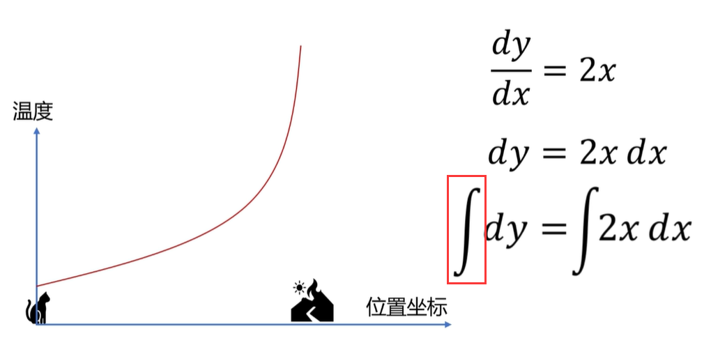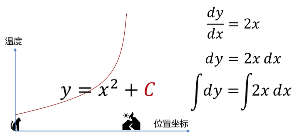 假如你通过你的实测得出了,温度的变化率呢,是服从2x的规律变化的,诶,这样我们就得到了一个微分方程,你只要把它解出来,就可以得到 Y 的表达式了,也就是温度随位置的分布函数。