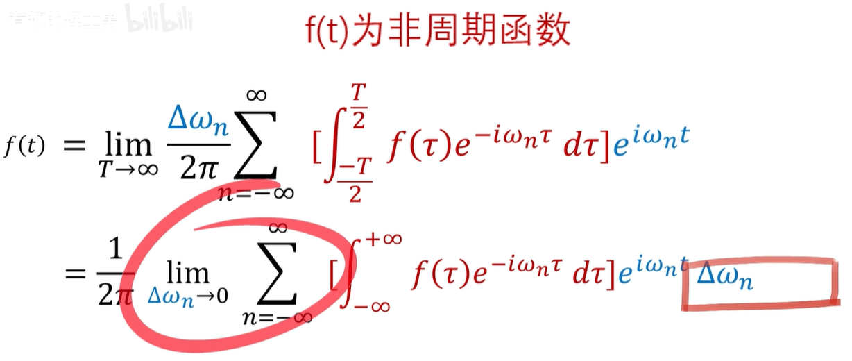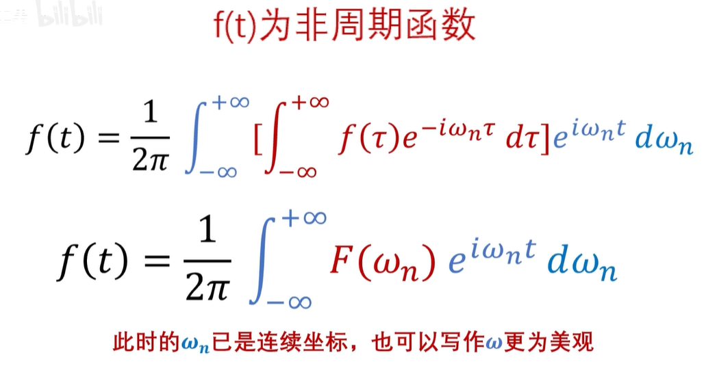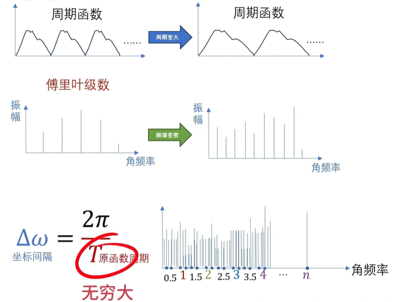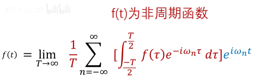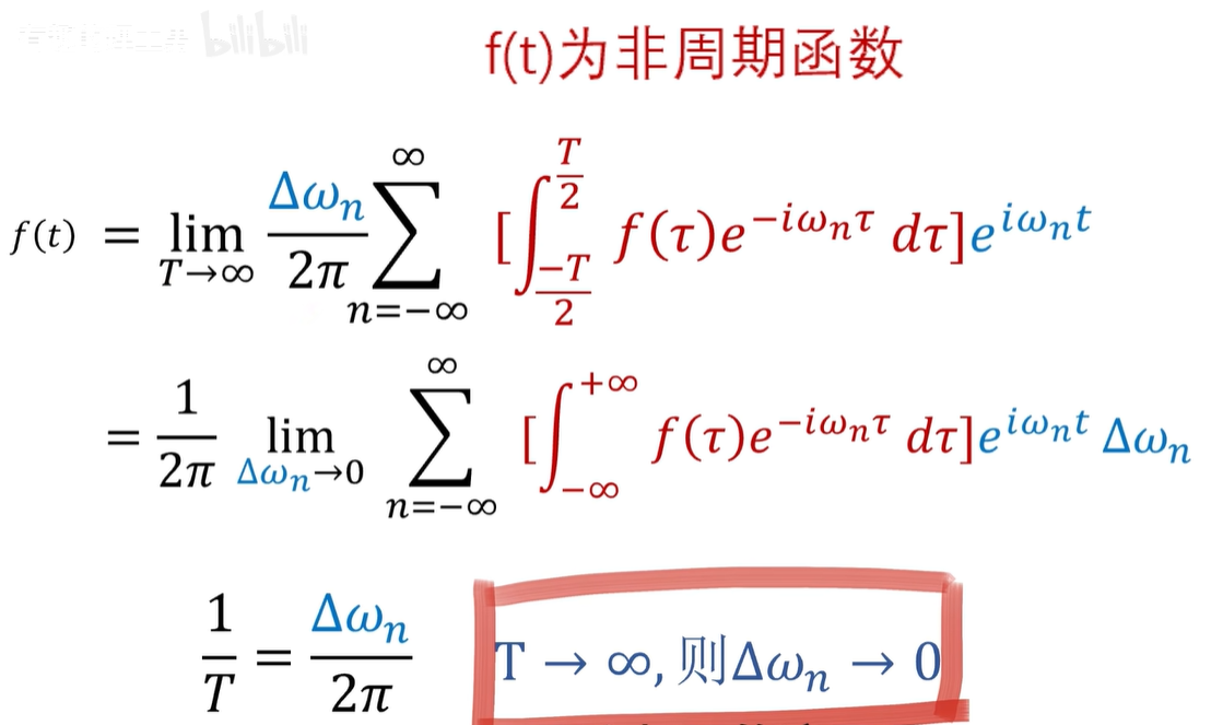 还没啊,因为这是周期函数的频谱是离散的,如果是非周期的函数呢,非周期函数,实际上可以看成是周期无穷大的情况,也就是 T 趋向于无穷,这里呢,我们可以用一个极限来表示啊。