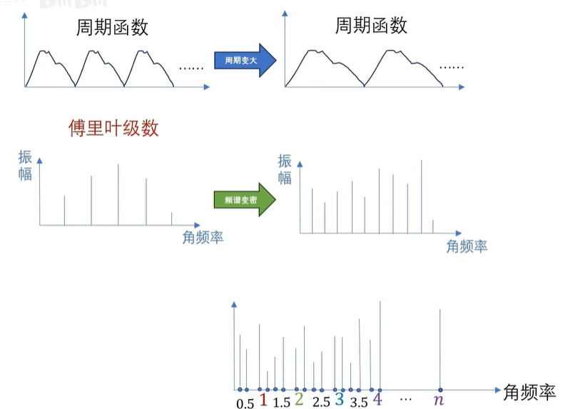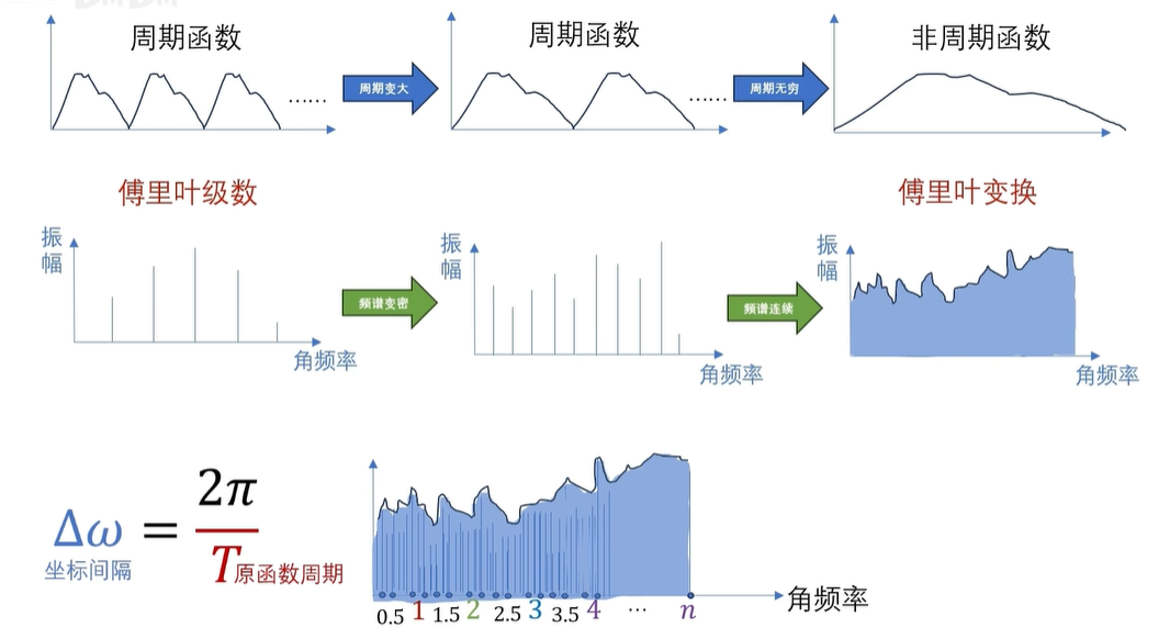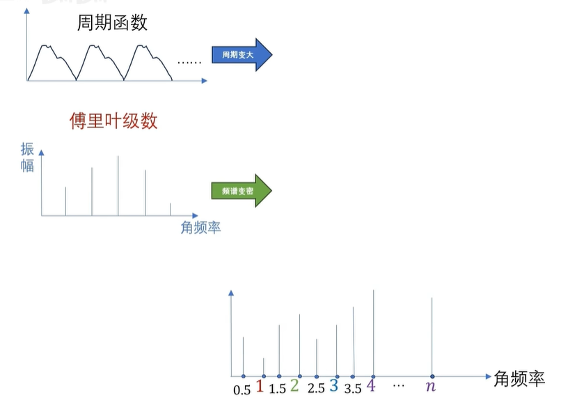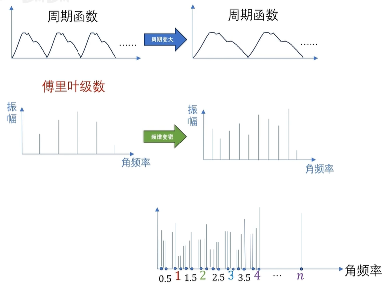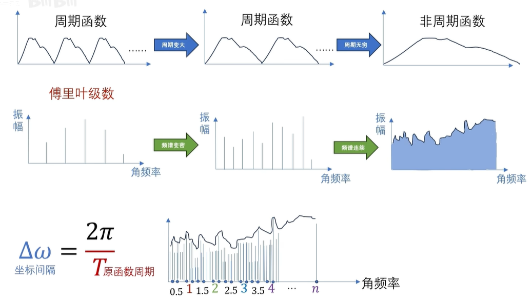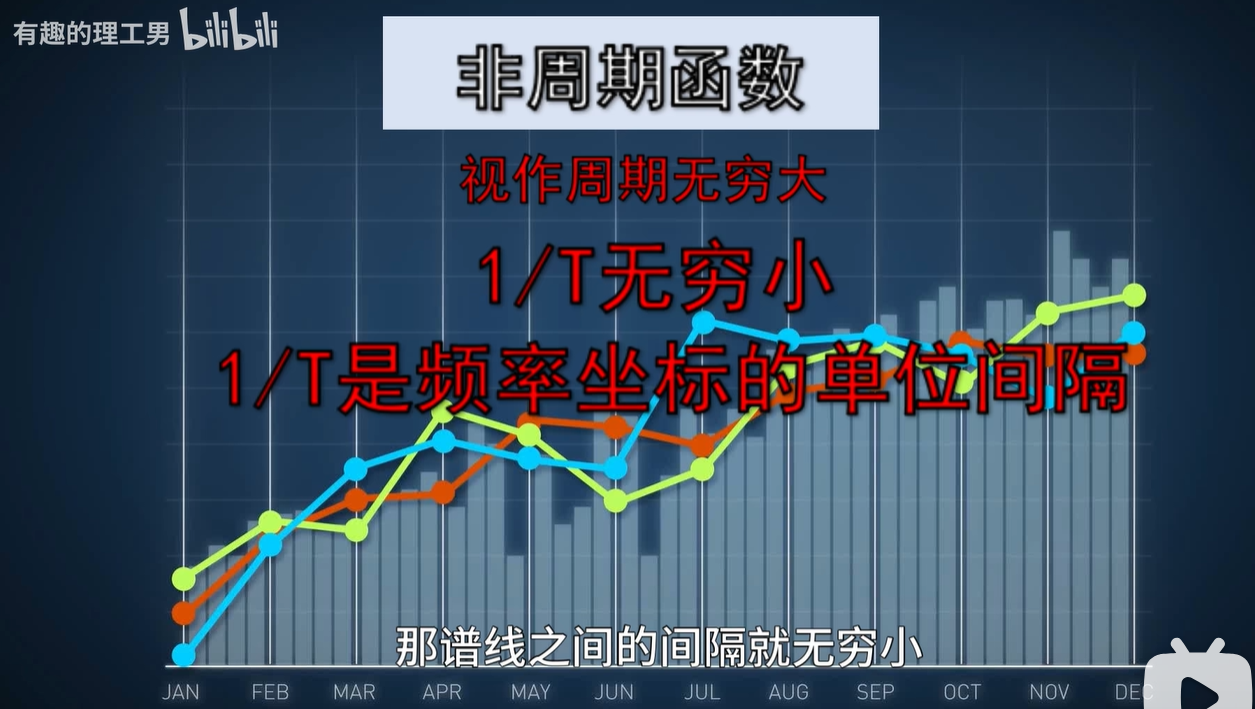 还没啊,因为这是周期函数的频谱是离散的,如果是非周期的函数呢,非周期函数,实际上可以看成是周期无穷大的情况,也就是 T 趋向于无穷,这里呢,我们可以用一个极限来表示啊。