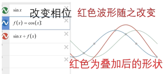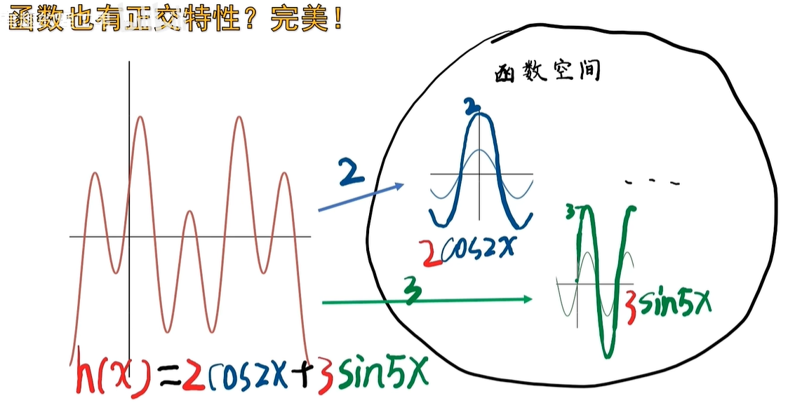 例如函数 H(x) 在 cos (2x) 基底上的投影为2,在 sin (5x) 的基底上的投影为3……在其他的基底投影呢为0,就不写了,但这个投影改变的不是它的长度,而是振幅,那这个 H(x) 呢,我们就可以写成 2cos (2x)+3sin (5x)。