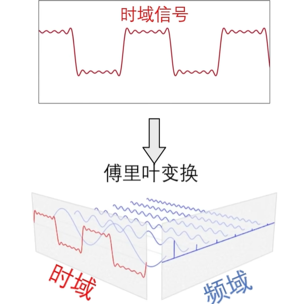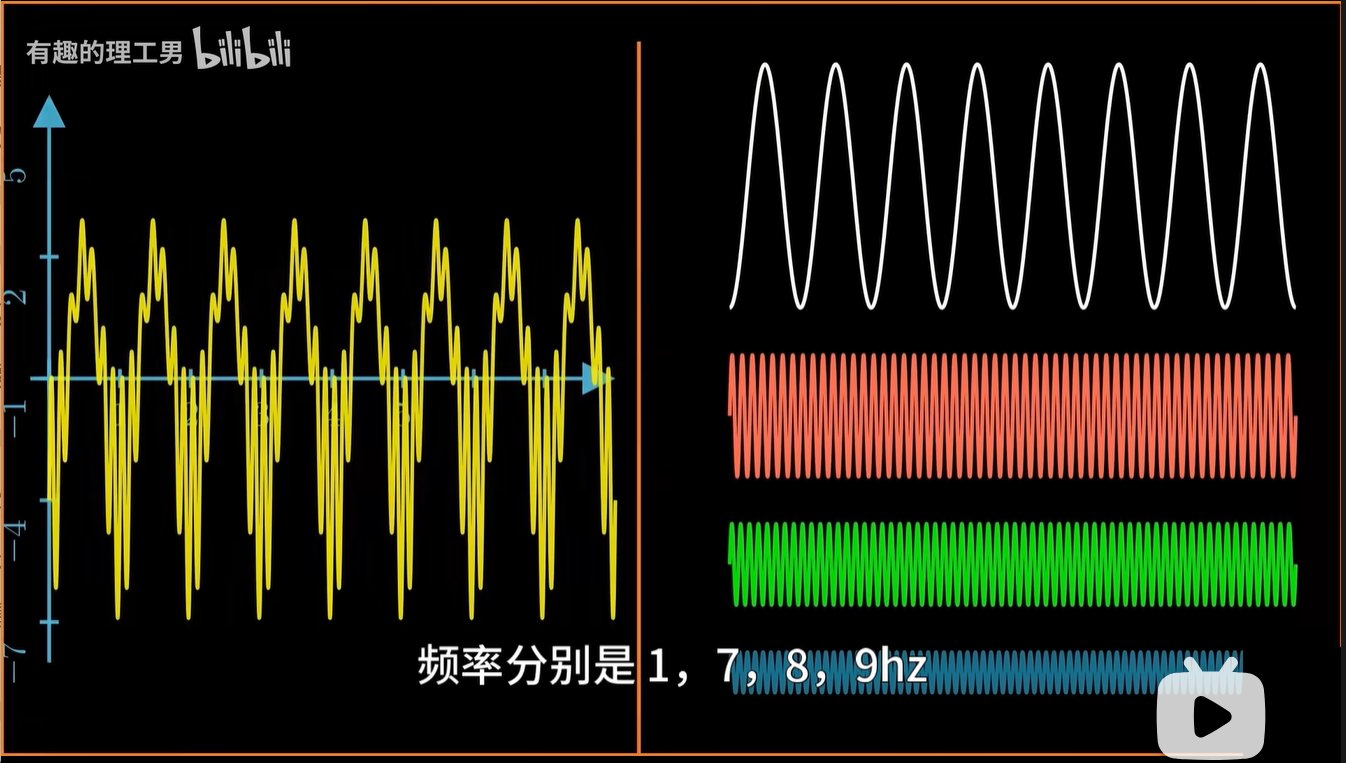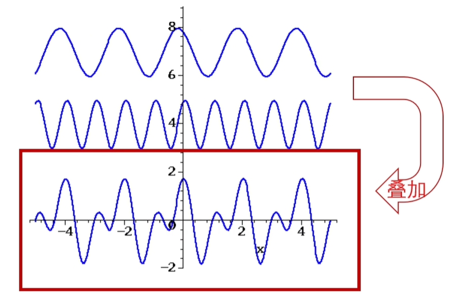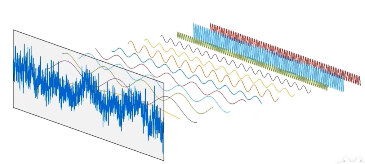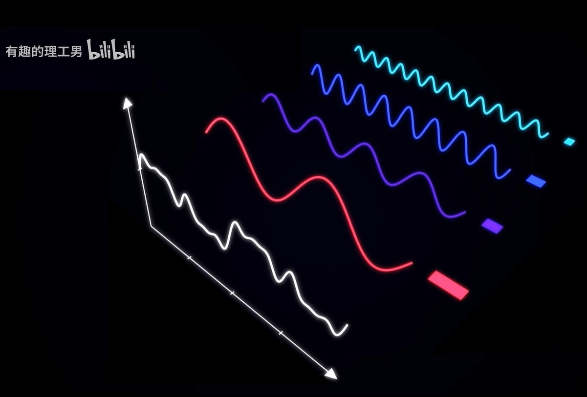 傅里叶变换可以让我们把这些混叠在一起的信号分拆开,让我们知道这个信号是由哪些频率成分构成的。