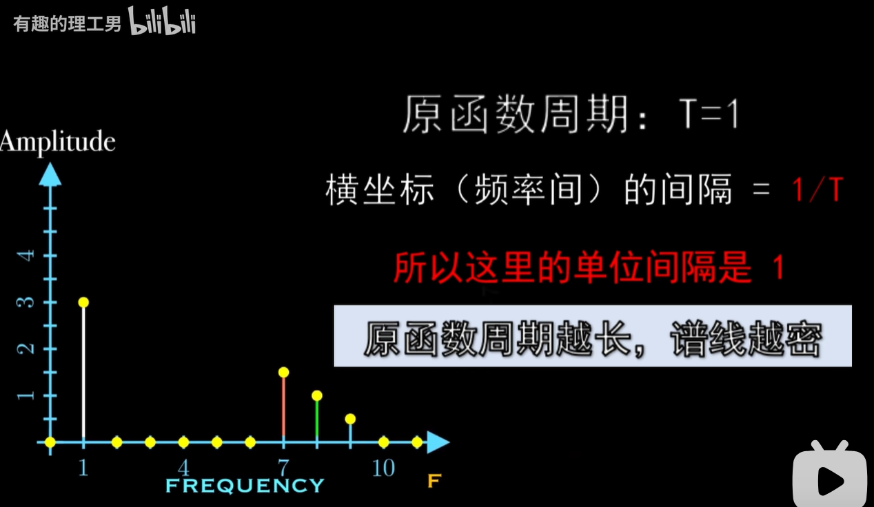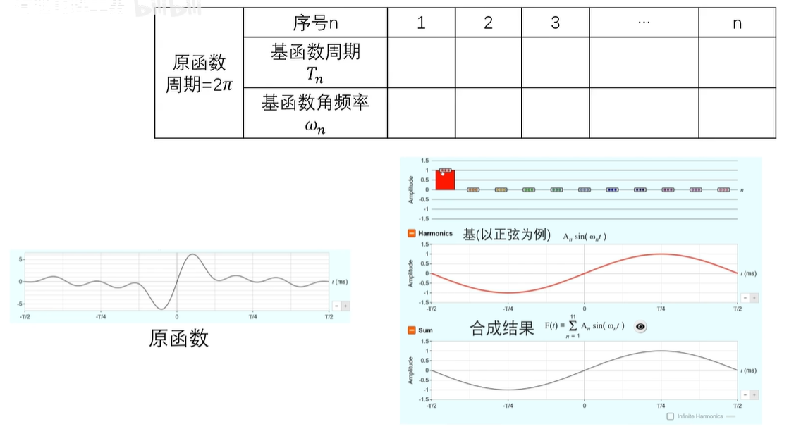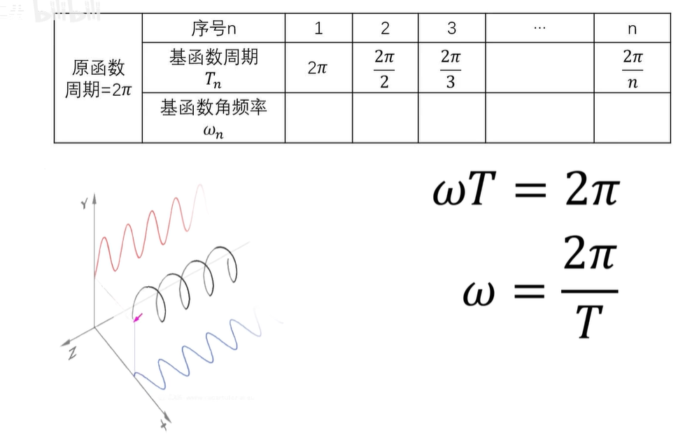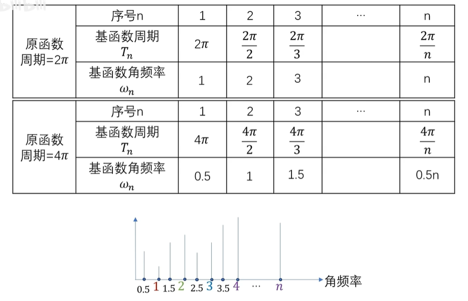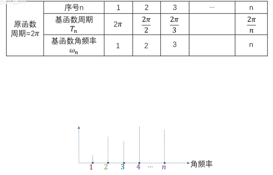 例如2π周期函数的基频率间隔呢,是一弧度每秒,所以它的频谱的横坐标呢,就是1、2、3、4,一直到 N ,一个频率对应一个基,那它的基呢,就是 E 的 INT 次幂。