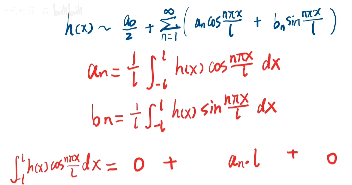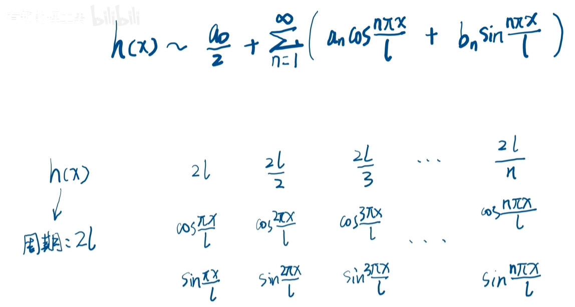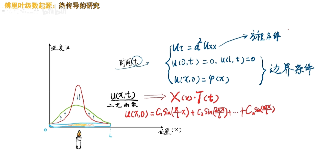 其实啊,这就是一个傅里叶级数的特例,初始的温度函数呢,就相当于被分解为无穷多个,三角函数的相加了。