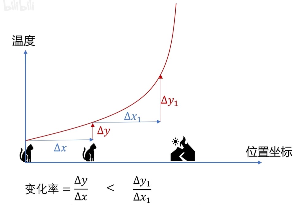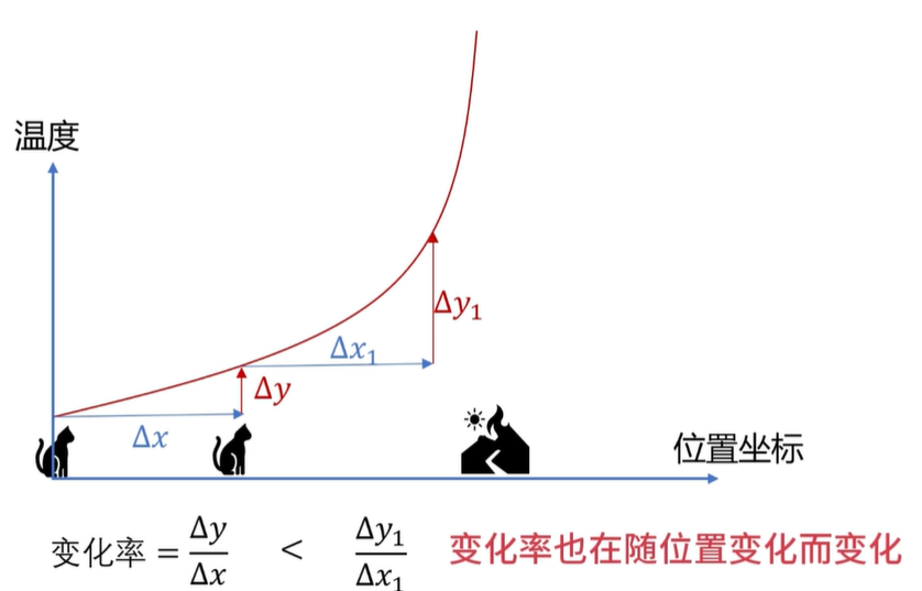 我们是这样子衡量温度变化的是否剧烈的啊,在你当前的位置向前挪∆x,相应的呢,就会带来温度上的变化,变化量是∆y,再用∆y除以∆x来表示温度随位置的变化率,这个数值越大,就证明温度随位置的变化就越剧烈。