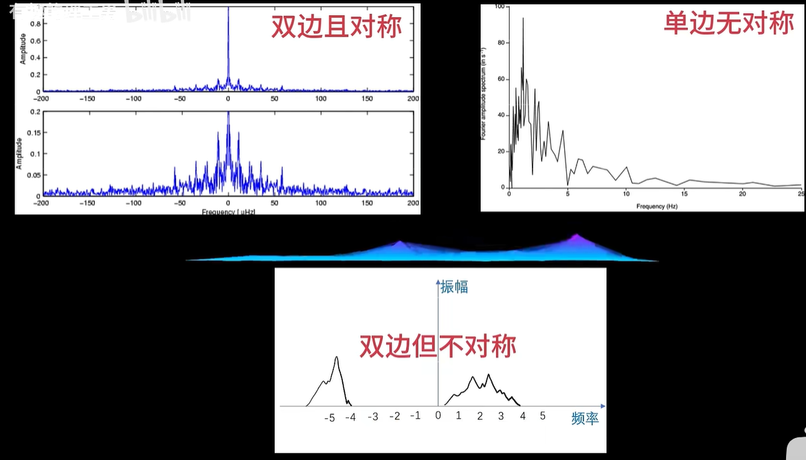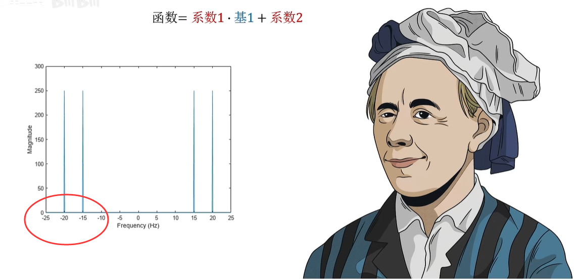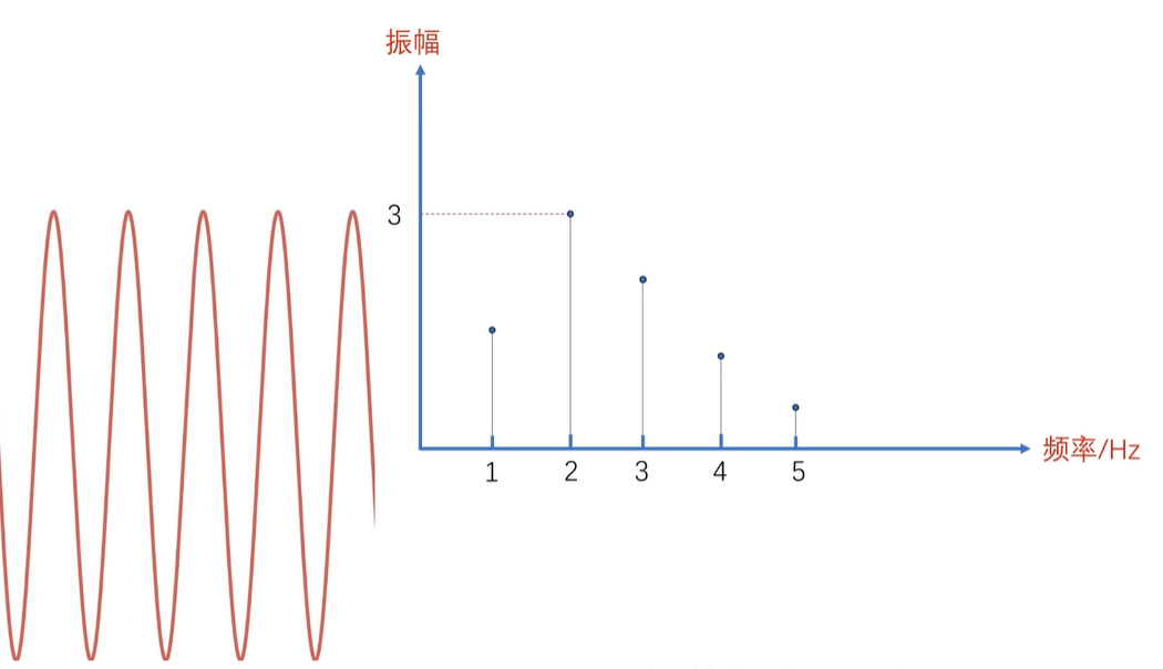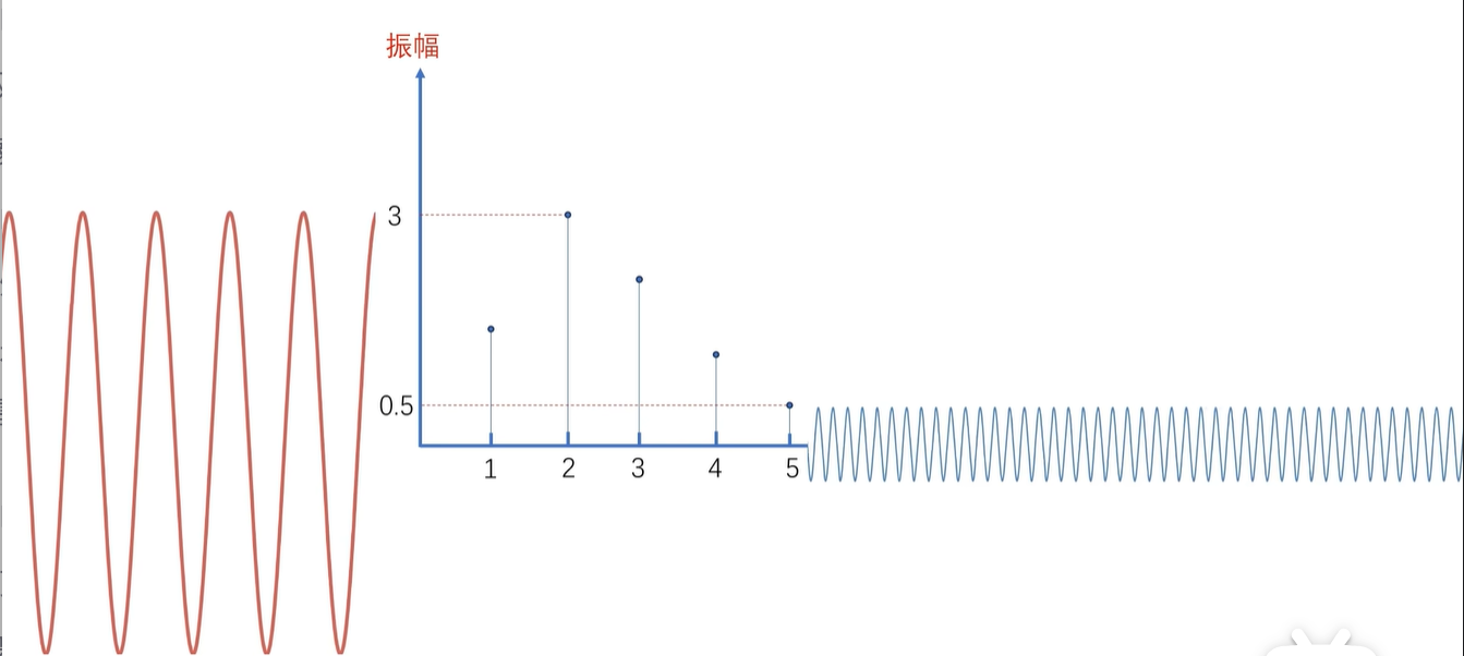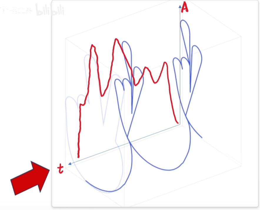 例如刚才的信号经过傅里叶变换之后就成了这样,从侧面看拆分后的频率投影,其实就是频域图。
