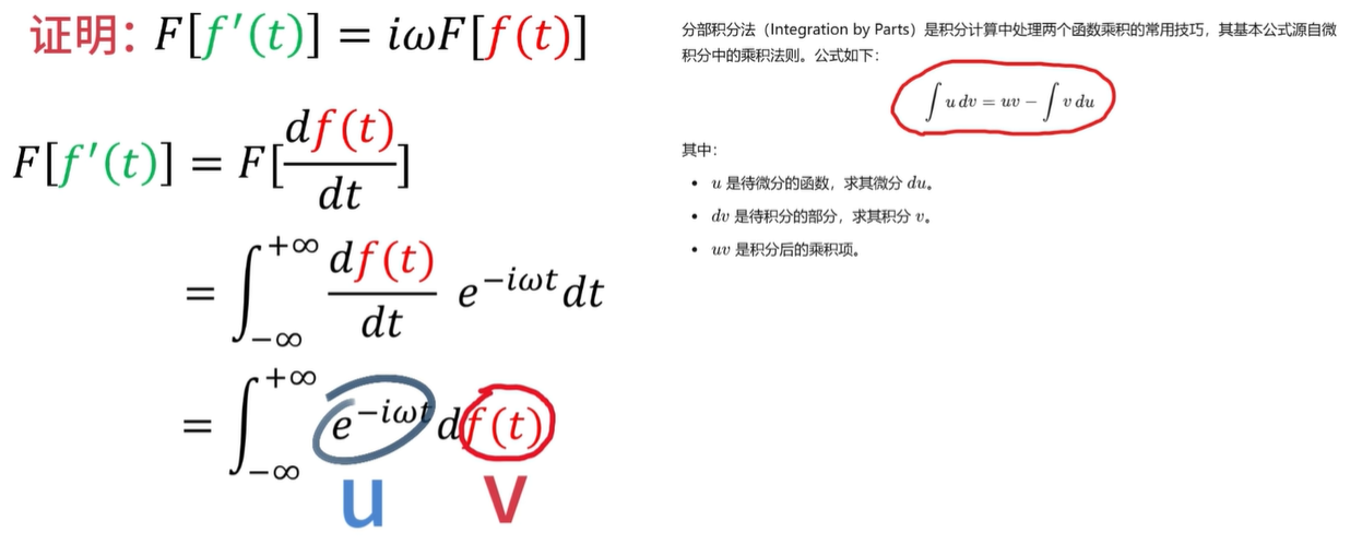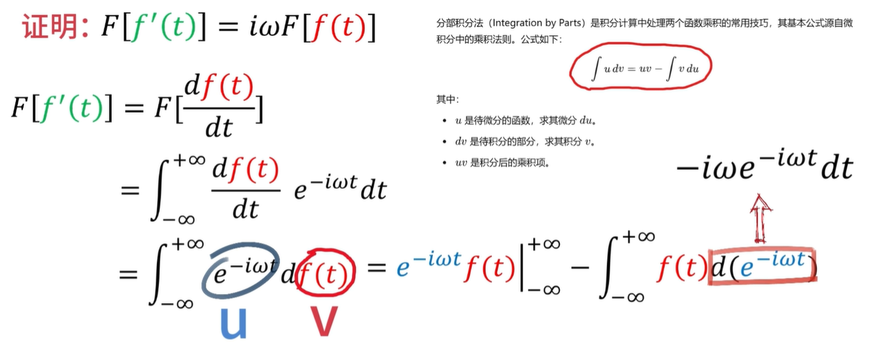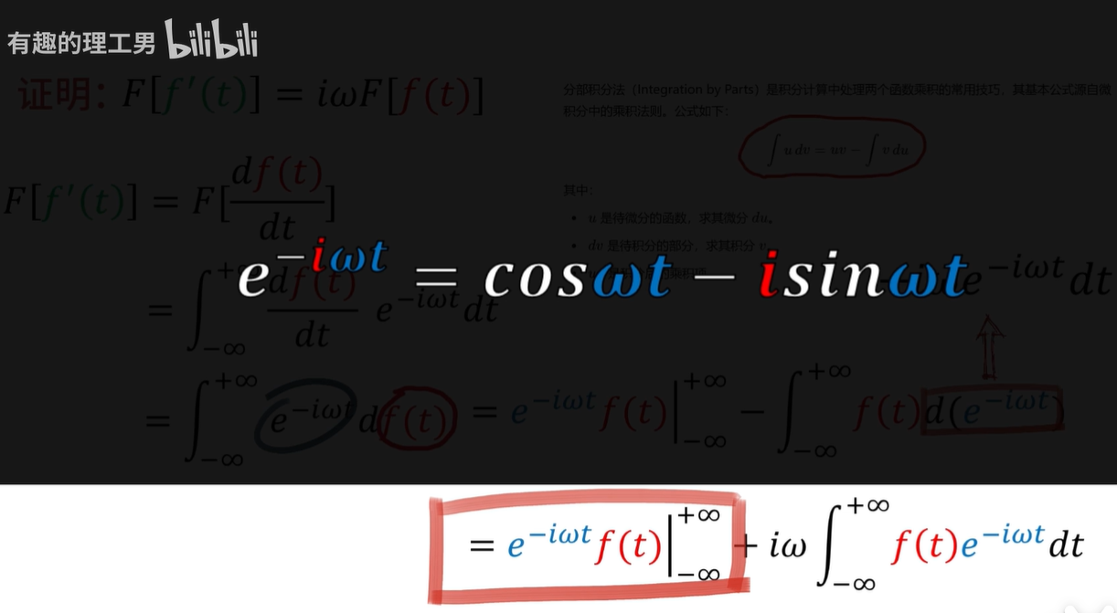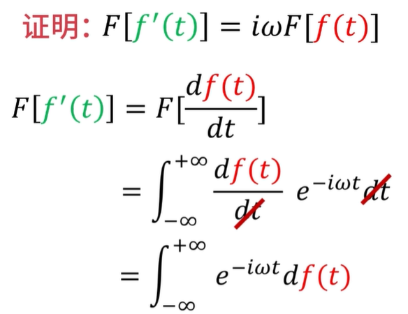 现在就让我用数学证明一下啊,首先对df除以dt,用傅里叶变换公式套上来,那么这里的dt呢,可以约掉,整理一下就得到这个结果。