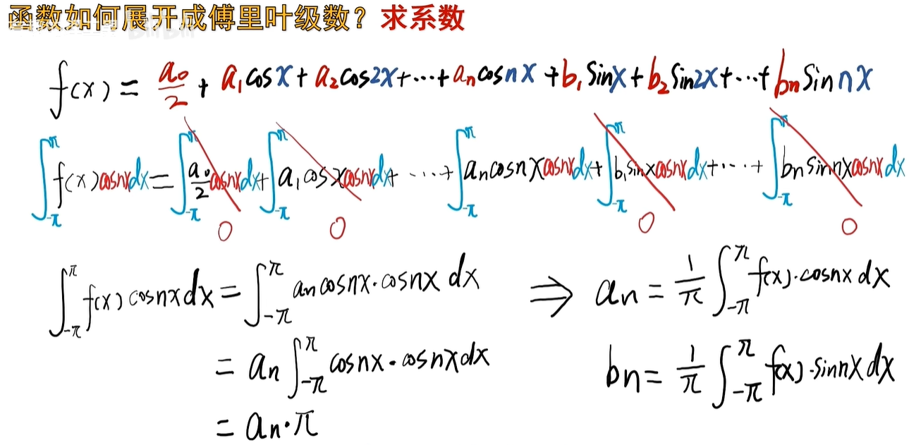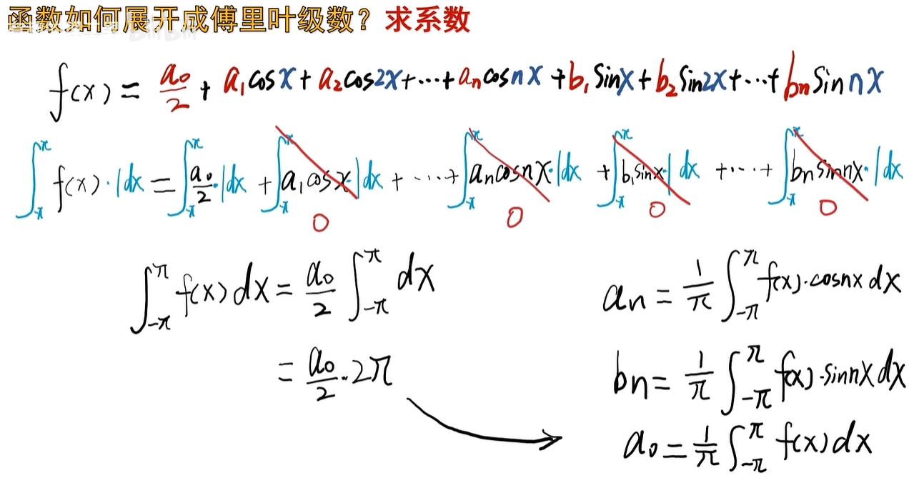 然后呢,再求积分,因为周期是2π,所以积分的范围是从-π积到π,当然积分的上下限的差距,保证是一个周期就行了啊,0~2π也是可以的。
