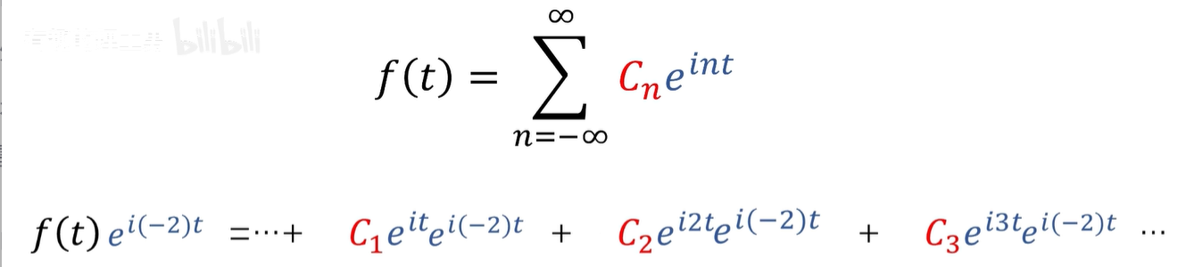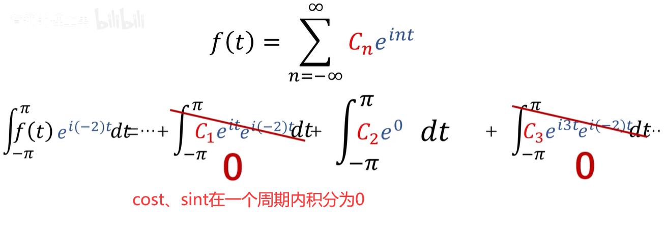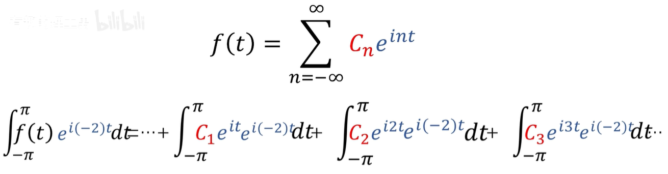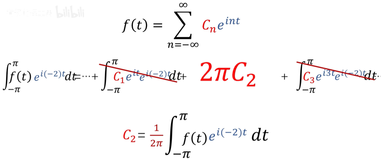 我们可以利用傅里叶级数基的正交性,例如我想求第二项系数,也就是 C2的值,只需要左右两边同时乘以 C2项,基的共轭,e^(-i2t)次幂。