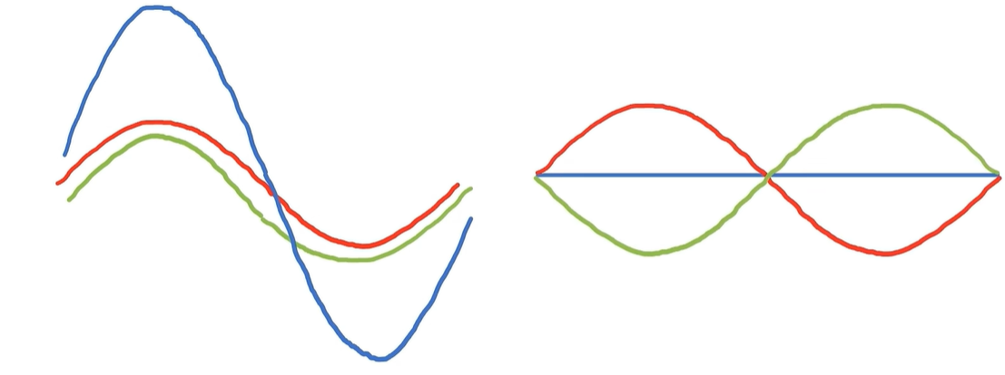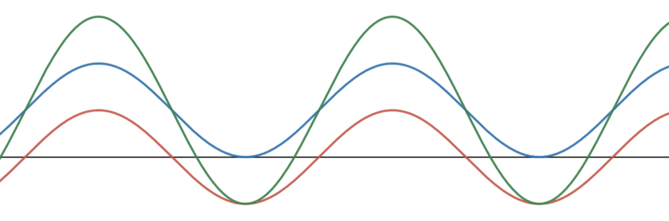 但是如果灯坏了,三个灯同时亮,这些信号在时间上就会有重叠,波形就会叠加,用时域的表达就会很看起来很混乱,也看不出有哪些频率成分。