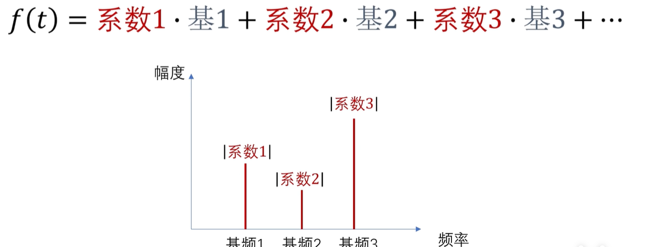 f(t)呢,是可以看成是一个系数乘以一个基,再加上另一个系数乘以另一个基,这样的不断不断的累加的啊,所以这些系数实际上就是频谱里面,对应频率的函数值。