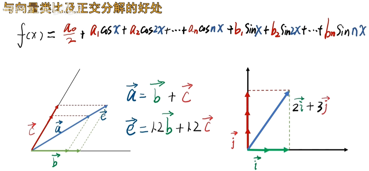 一个数乘以一个东西再加起来啊,这不就是线性叠加嘛,对于分解和线性叠加,你们想到了什么呀,对了,向量,你可以把它按平行四边形法则啊,像这样把它分解了,A 向量呢,可以分解成 B 向量和 C 向量的相加,如果向量再长一点,只需要在 B 向量和 C 向量,前面乘个数就行了,像这样这样分解虽然可以啊,但是分解完之后的,相互之间呢,还是存在着投影,A 向量换个方向之后计算也不方便,因为按平行四边形来分的话,对称性并不好。