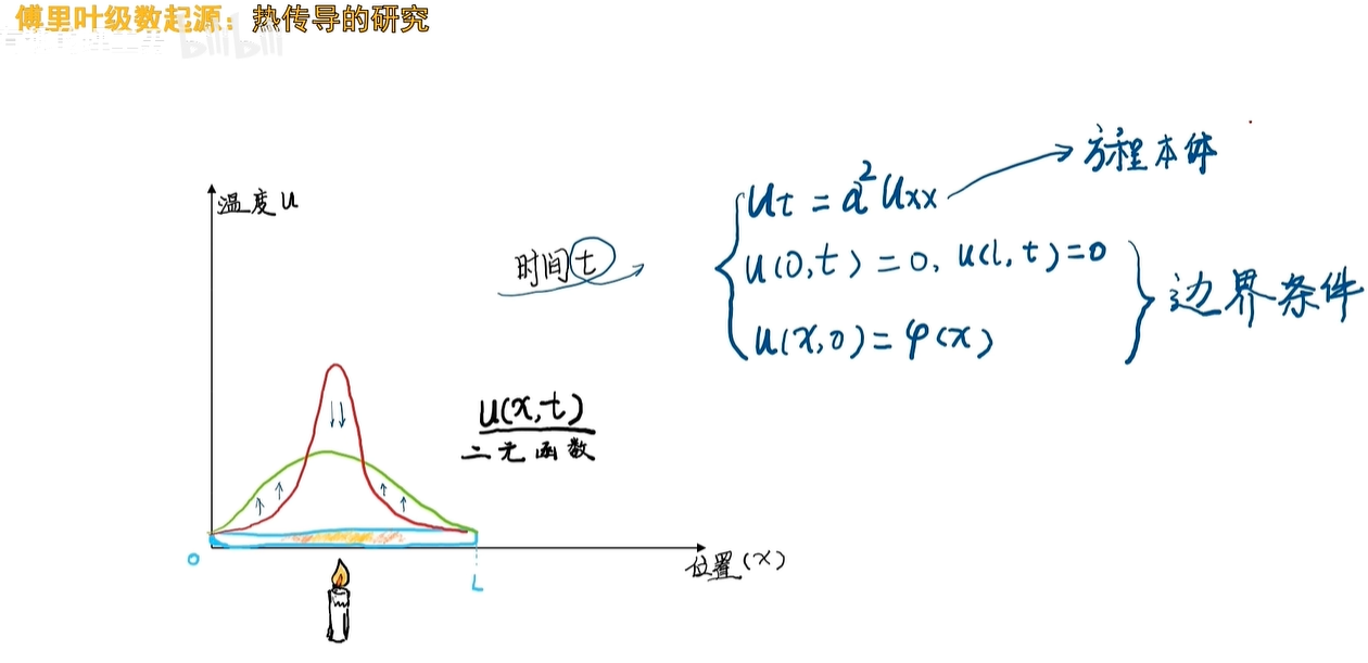 随着时间的流逝呢,温度会向原来低温的地方扩散啊,那这个温度函数应该是一个关于位置和时间的二元函数u(x,t),如果你要求这个 u(x,t) 出来啊,你就得把这个方程给解出来。