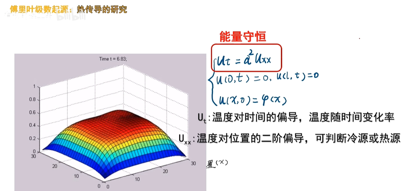 这是一个偏微分方程,Ut 是温度随时间的变化率,Uxx 是温度随位置分布的二阶偏导,那它们呢,就构成了这样的等量关系啊。