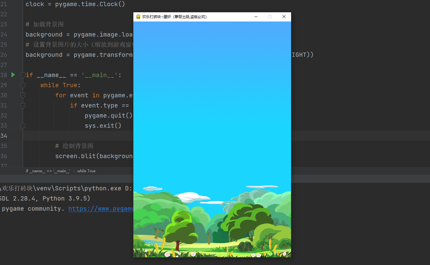 在 main.py 中加载背景图片,由于背景图片像素是 755*1334,这个要比游戏窗体要大,因此我们需要将背景图先缩放到游戏窗体的同等大小,然后再画背景图。