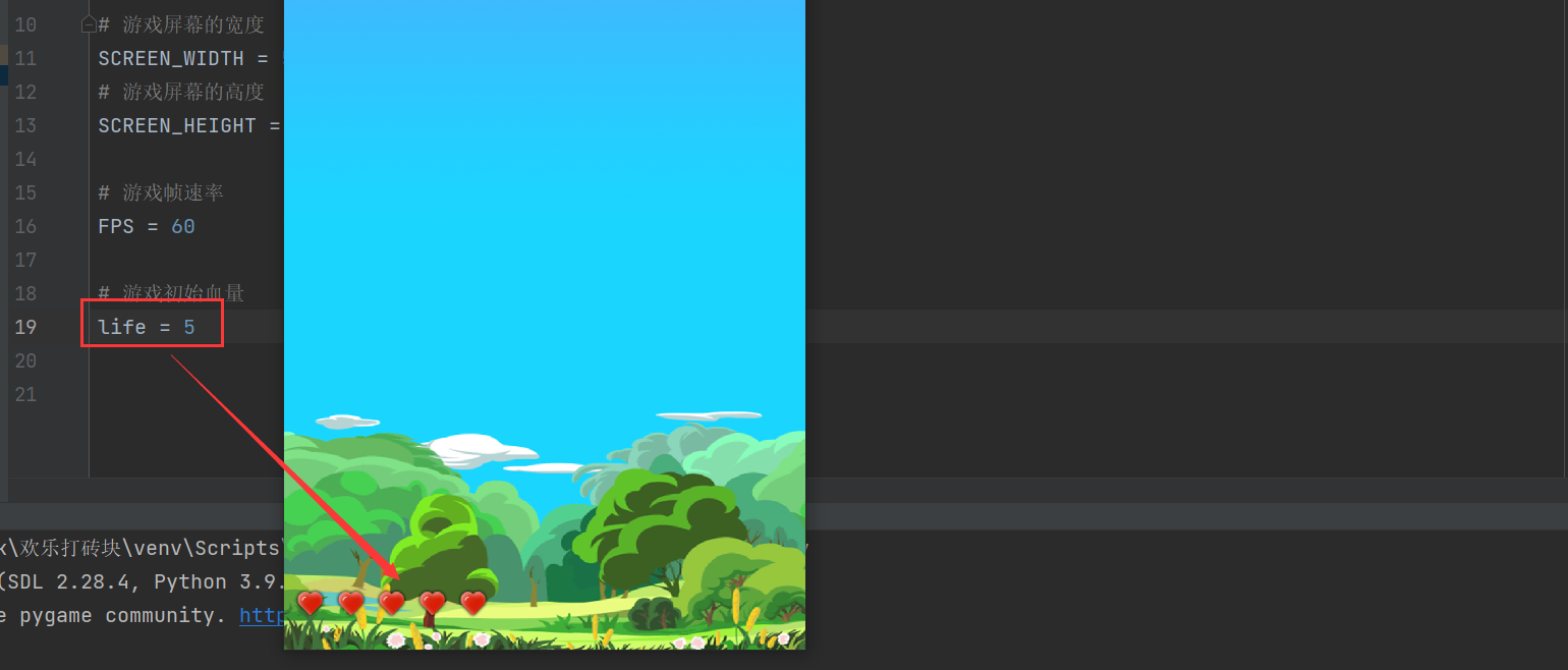 初始的血量是 3,所以画了 3 个爱心,可以修改 constant.py 中的初始血量,那么显示的效果就会不一样,如下图所示: