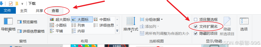 (2)看顶部菜单栏,找到 “查看” 选项,点一下,然后在 “显示 / 隐藏” 那栏,把 “文件扩展名” 前面的勾打上 —— 搞定!然后你再看文件,后面的 “.docx”、“.xlsx” 就都显示出来了,是不是超简单?