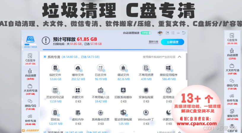 (3)如果explorer文件资源管理器打开异常,卡慢,可能是文件管理器缓存文件过多导致,可以点击文章尾部的官网链接卡片,前往其官网并使用极智C盘清理软件的系统垃圾清理功能来清理缓存垃圾文件,保持系统干净清爽,远离文件资源管理器打开卡顿。
