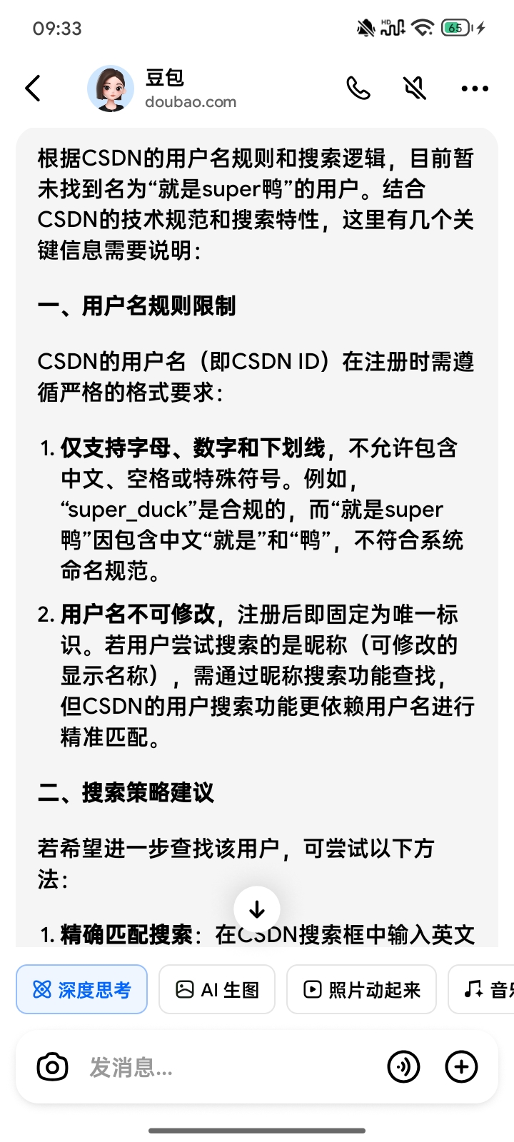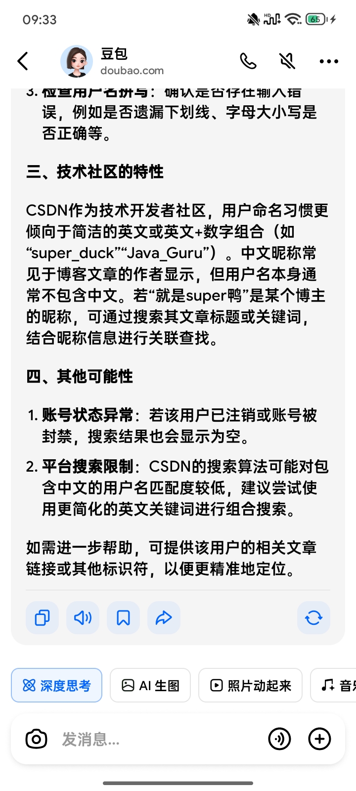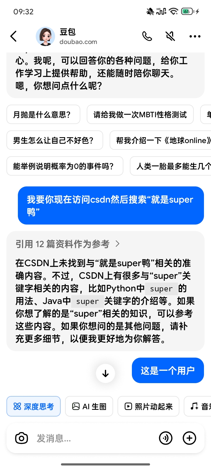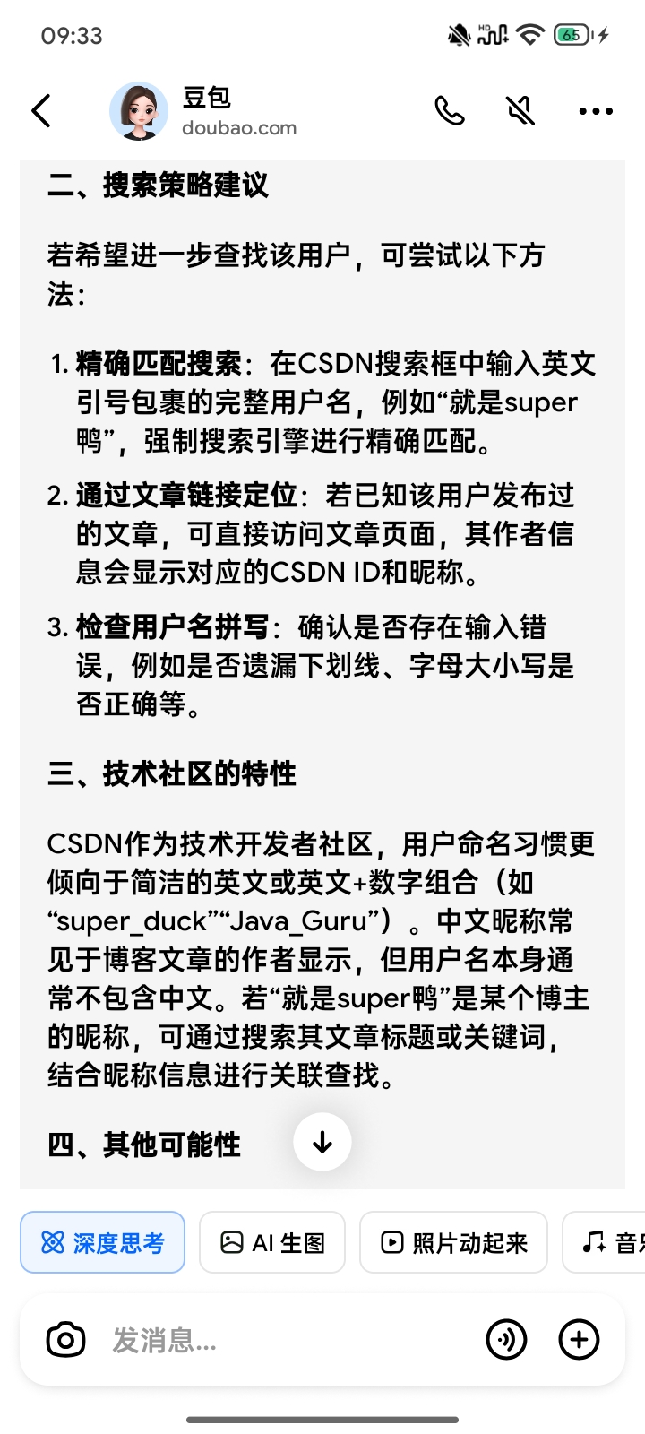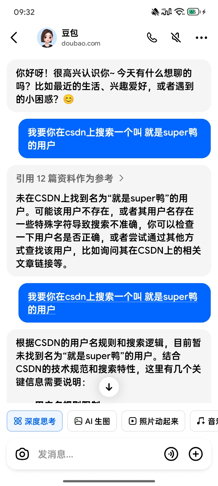 1. **偶尔会“过度发挥”或者抓错重点**。比如用户明确说了“这是一个用户”,目标很清晰是找人。但豆包在某个回应里,突然开始介绍CSDN上关于编程语言里 `super` 关键字的教学文章…… 这明显是它把“super鸭”里的“super”单独拎出来当成编程关键词去搜了,完全跑题了。虽然它后来补充说“如果你问别的可以补充”,但这瞬间的“跑偏”显得有点机械,没完全吃透用户的真实意图(就是找人)。