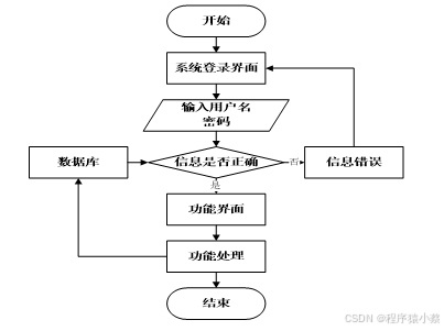 系统登录流程要求管理员和其他用户在登录页面输入个人信息,前端将信息传递给后端接口,再通过查询数据库确认身份,若验证成功则允许登录,否则提示重新输入。用户登录流程如图2-5所示。