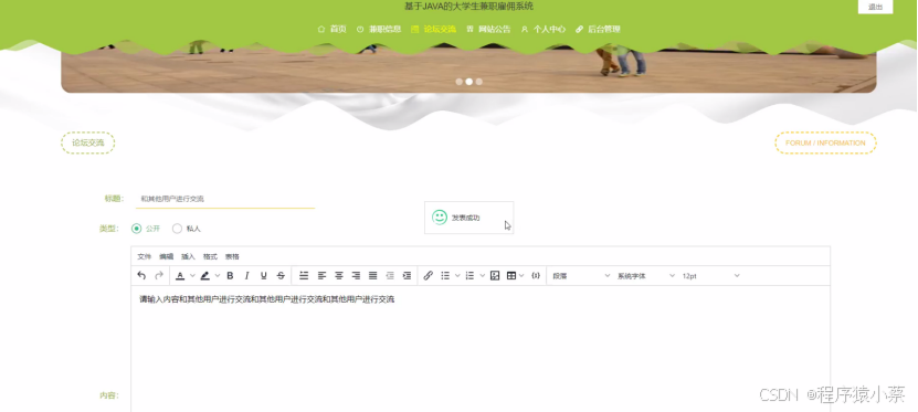 学生点击论坛交流;在论坛交流页面的填写标题、类型、内容等信息,可以发布帖子等操作;如图5-4所示。