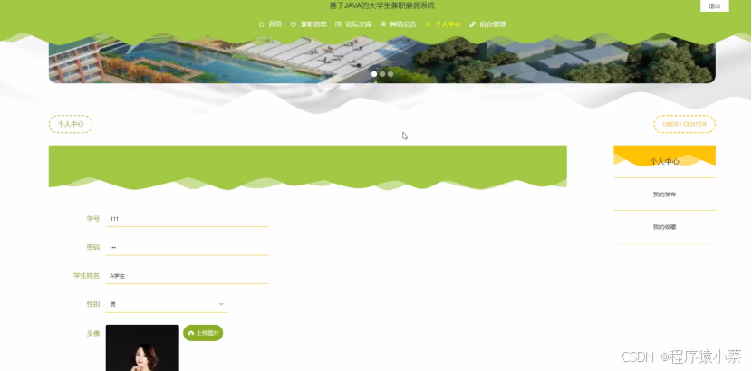 在个人中心页面可以输入个人详细信息,进行信息更新操作,还可以对我的发布、我的收藏进行详细操作,如图5-5所示: