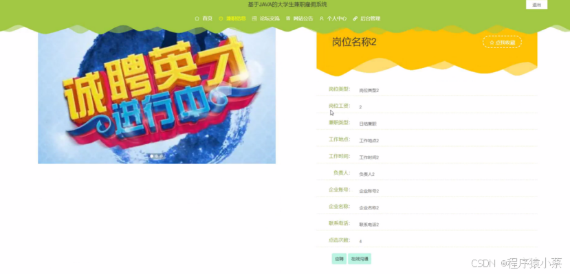 学生点击兼职信息;在兼职信息页面的搜索栏输入岗位名称、兼职类型,进行查询,然后可以查看岗位名称、图片、岗位类型、岗位工资、兼职类型、工作地点、工作时间、负责人、企业账号、企业名称、联系电话、点击次数等信息,也可以应聘、在线沟通或收藏等操作;如图5-3所示。
