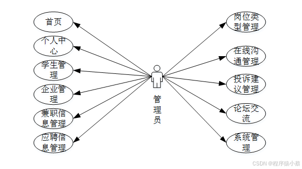管理员: 管理员能够访问并操作系统首页、个人中心、学生管理、企业管理、兼职信息管理、应聘信息管理、岗位类型管理、在线沟通管理、投诉建议管理、论坛交流、系统管理等功能。管理员用例分析图如图2-1所示。