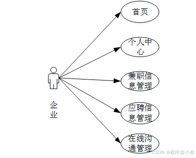企业: 企业用户可以访问首页、个人中心、兼职信息管理、应聘信息管理、在线沟通管理等功能。企业用例分析图如图2-3所示。