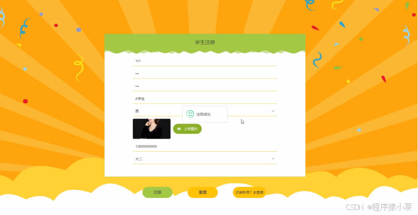 当学生进入前台系统进行相关操作前必须进行注册、登录,学生注册、学生登录界面如图5-2所示: