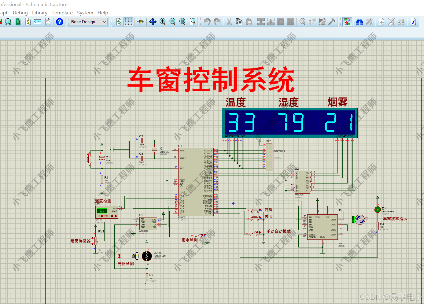 测量车内温湿度、烟雾浓度、车外光照以及下雨状况,自动调节车窗的开启和关闭。
