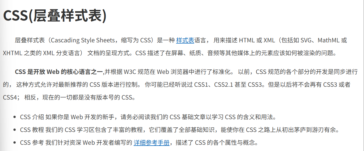 <li>CSS 介绍 如果你是 Web 开发的新手,请务必阅读我们的 CSS 基础文章以学习 CSS 的含义和用法。</li>