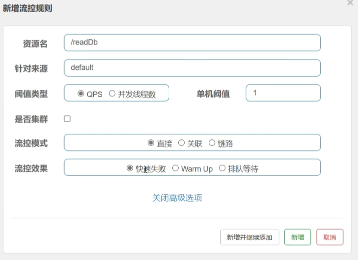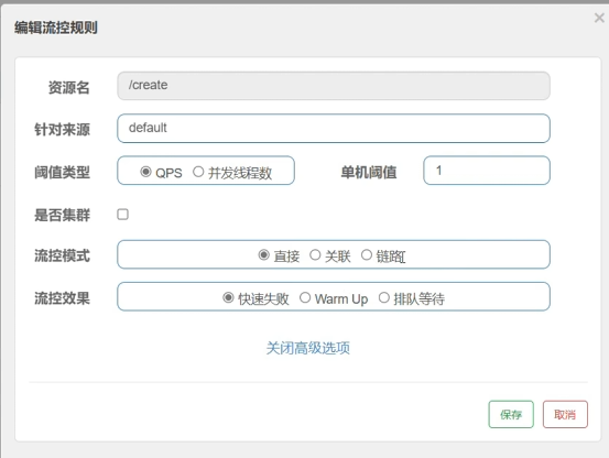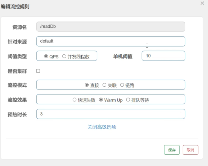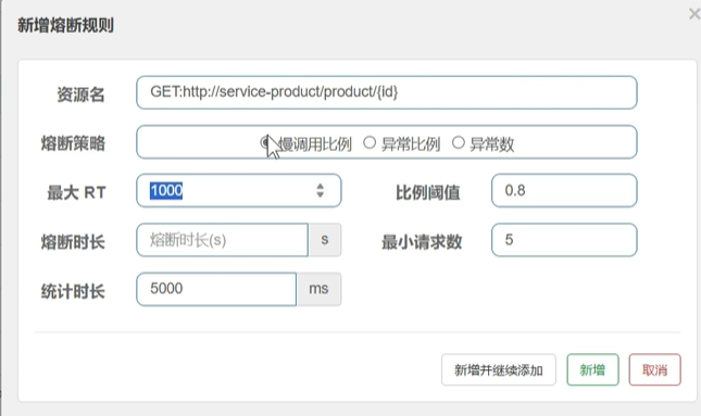 - 慢调用比例:慢调用在统计时长内所有请求中所占比例,超过该比例则断路器开启