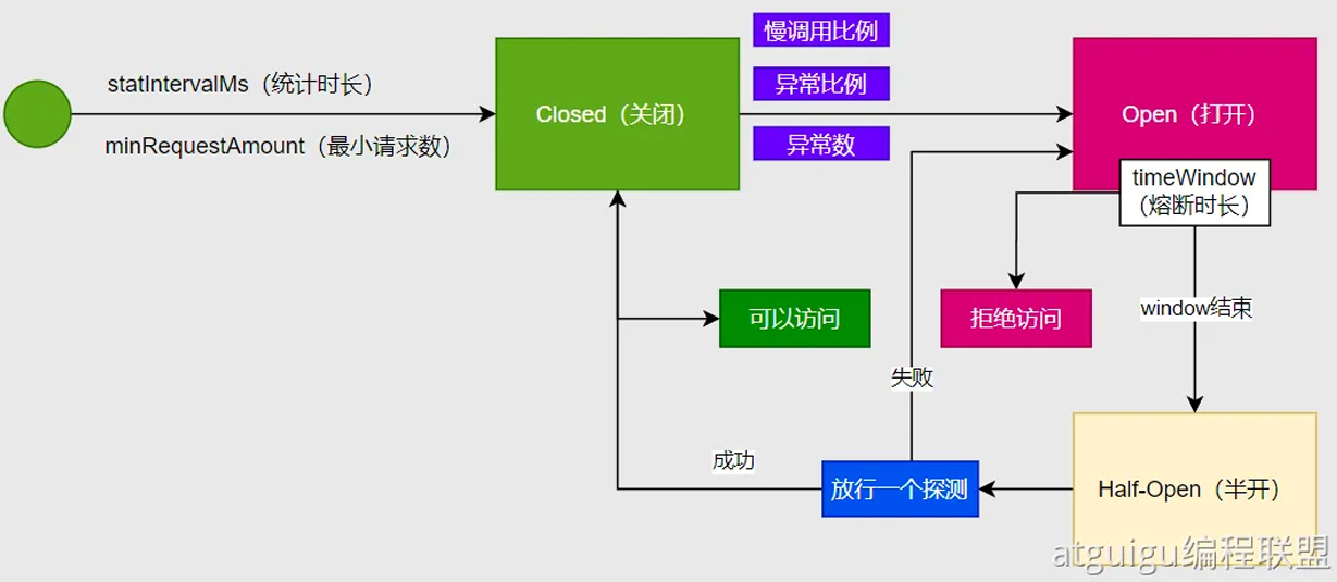 - 半开状态下:允许一个请求通过,根据返回结果选择闭合或是打开