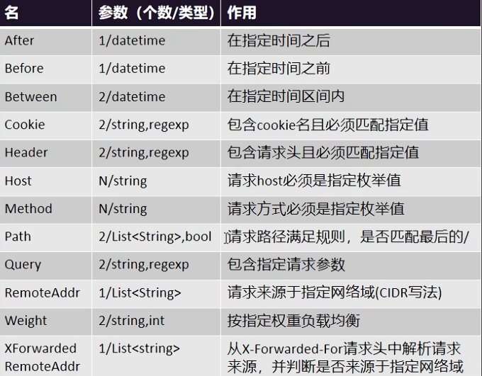 - predicates:请求前往指定服务、目的地需要满足的规则,可以多个(取并集)