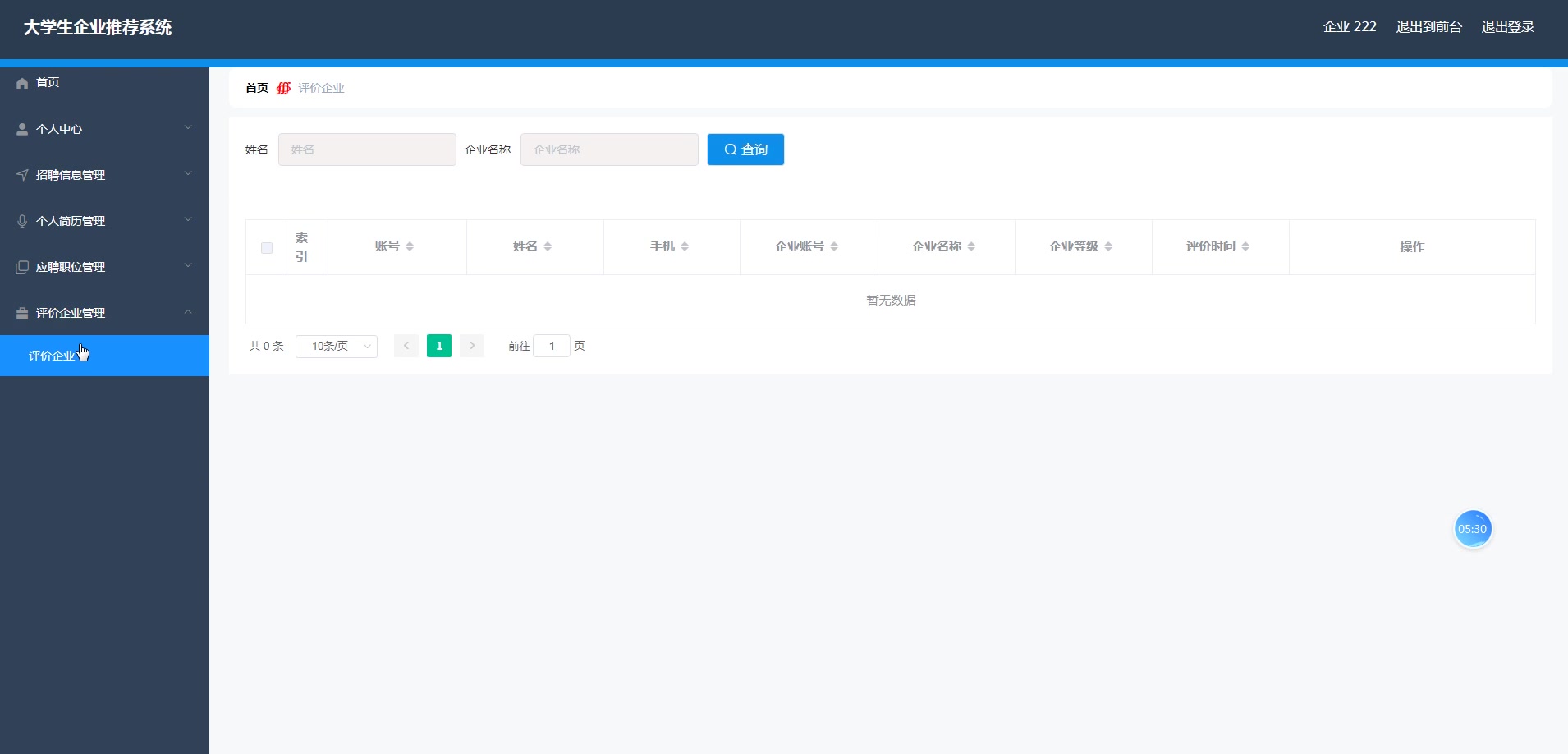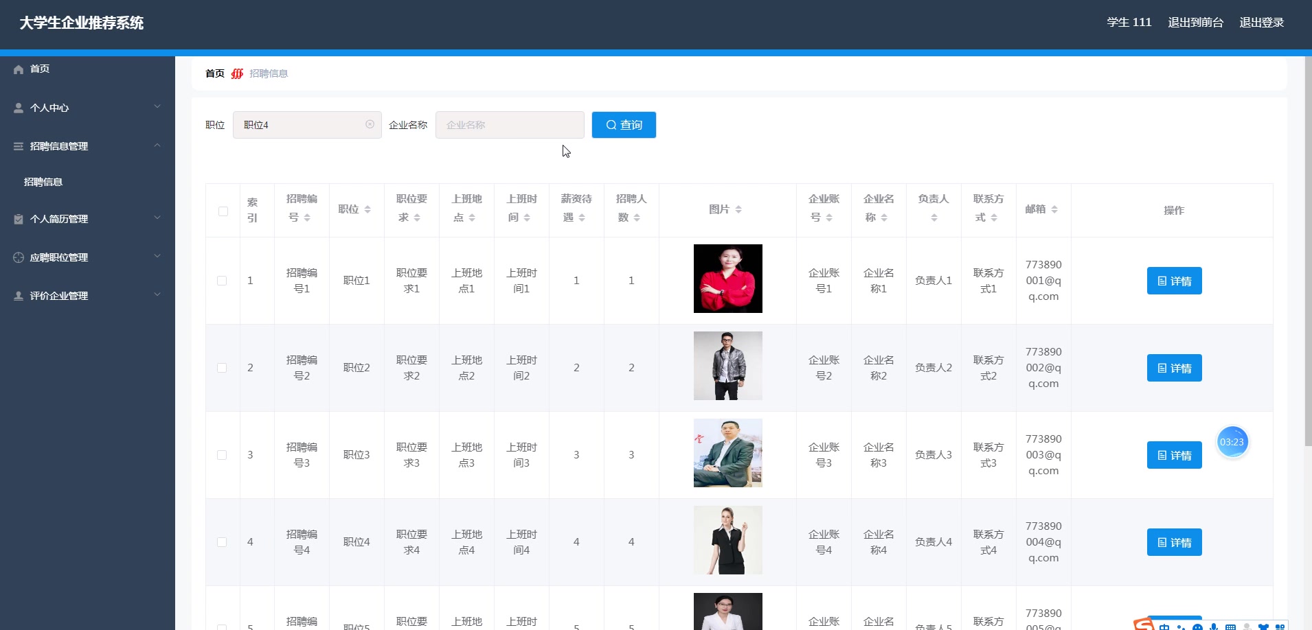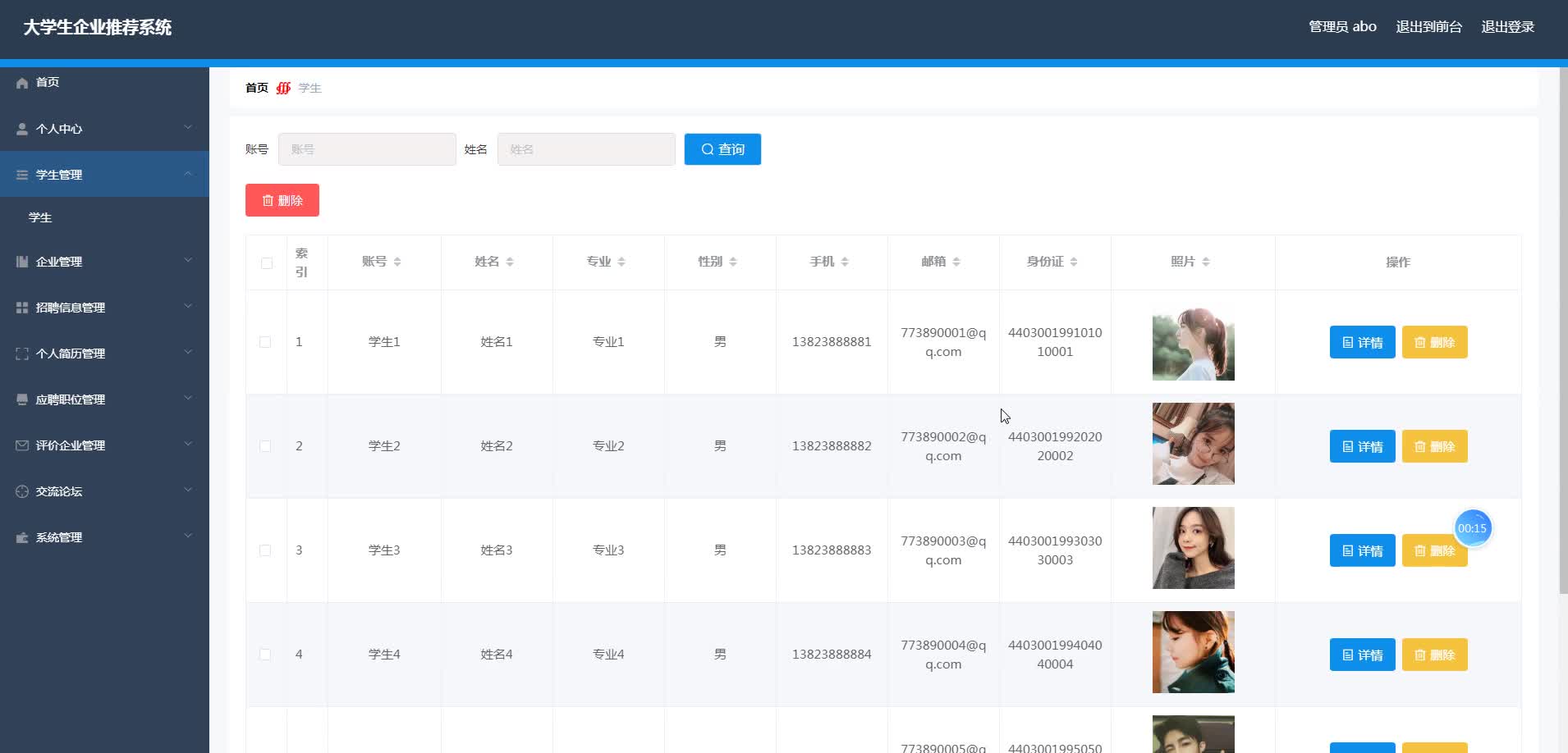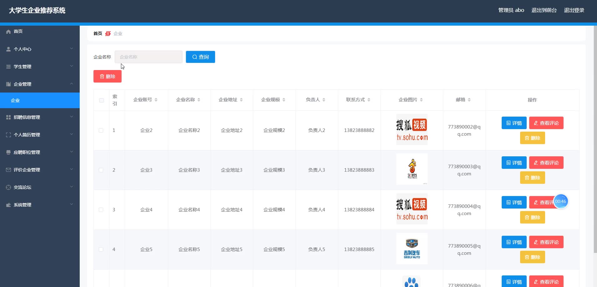 大学生企业推荐系统采用b/s结构、java开发语言、以及mysql数据库等技术。系统主要分为管理员和学生、企业三部分,管理员主要功能包括:首页、个人中心、学生管理、企业管理、招聘信息管理、个人简历管理、应聘职位管理、评价企业管理、交流论坛、系统管理,学生;首页、个人中心、招聘信息管理、个人简历管理、应聘职位管理、评价企业管理,企业;首页、个人中心、招聘信息管理、个人简历管理、应聘职位管理、评价企业管理,前台首页;首页、招聘信息、个人简历、交流论坛、个人中心、后台管理等功能,基本上实现了整个大学生企业推荐系统信息管理的过程。本系统在一般大学生企业推荐系统的基础上增加了最新信息的功能方便学生快速浏览,是一个高效的、动态的、相互友好的大学生企业推荐系统。