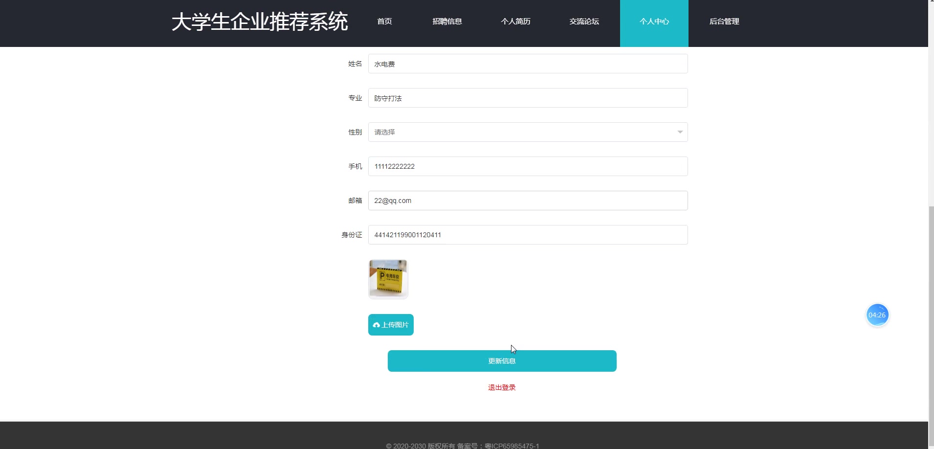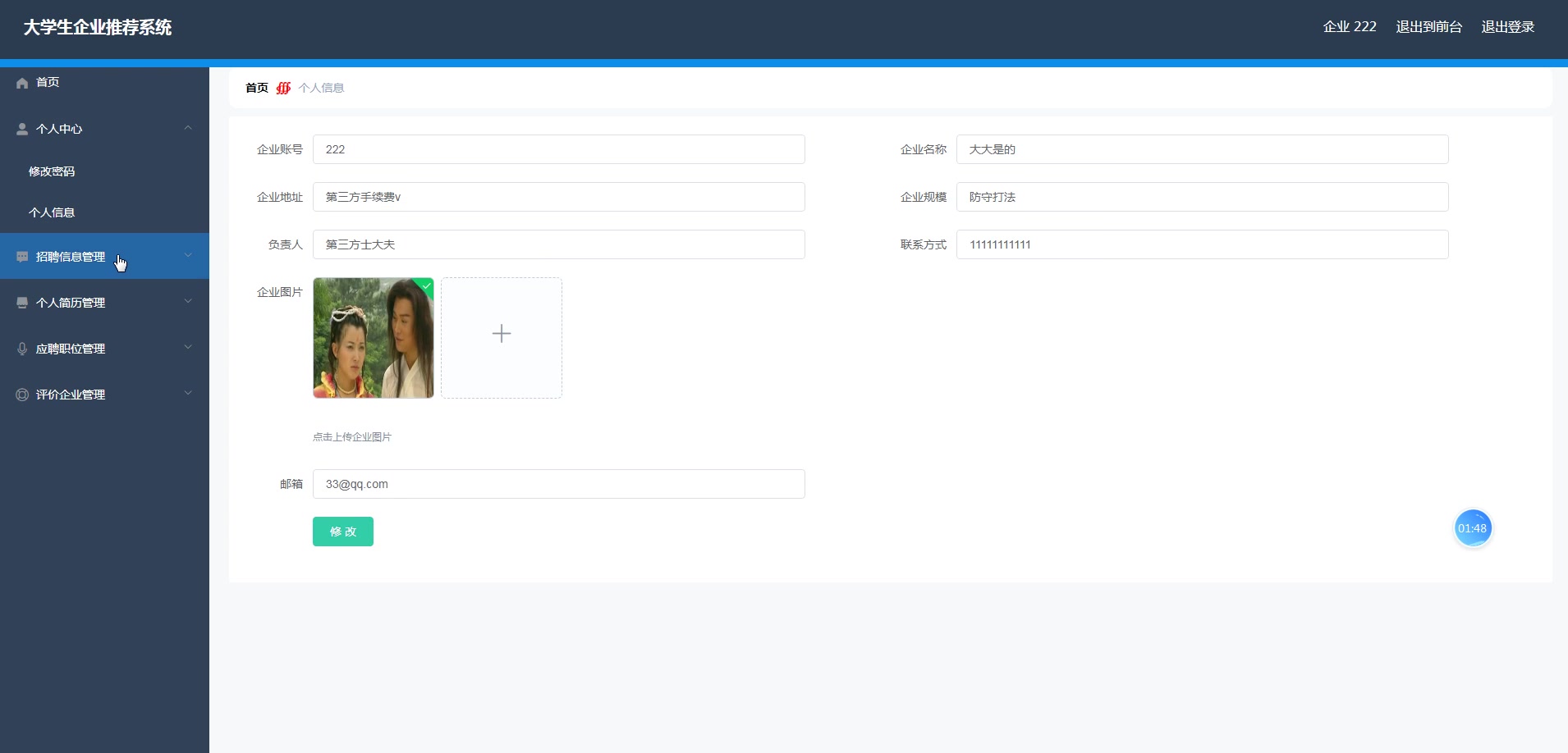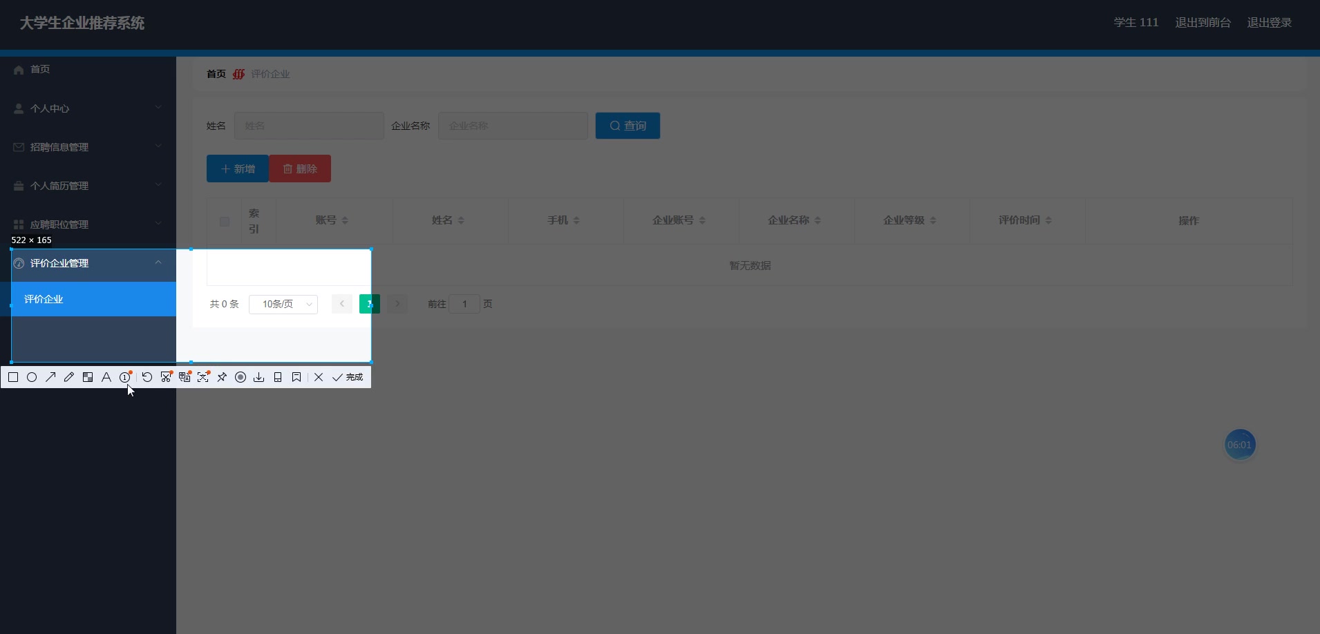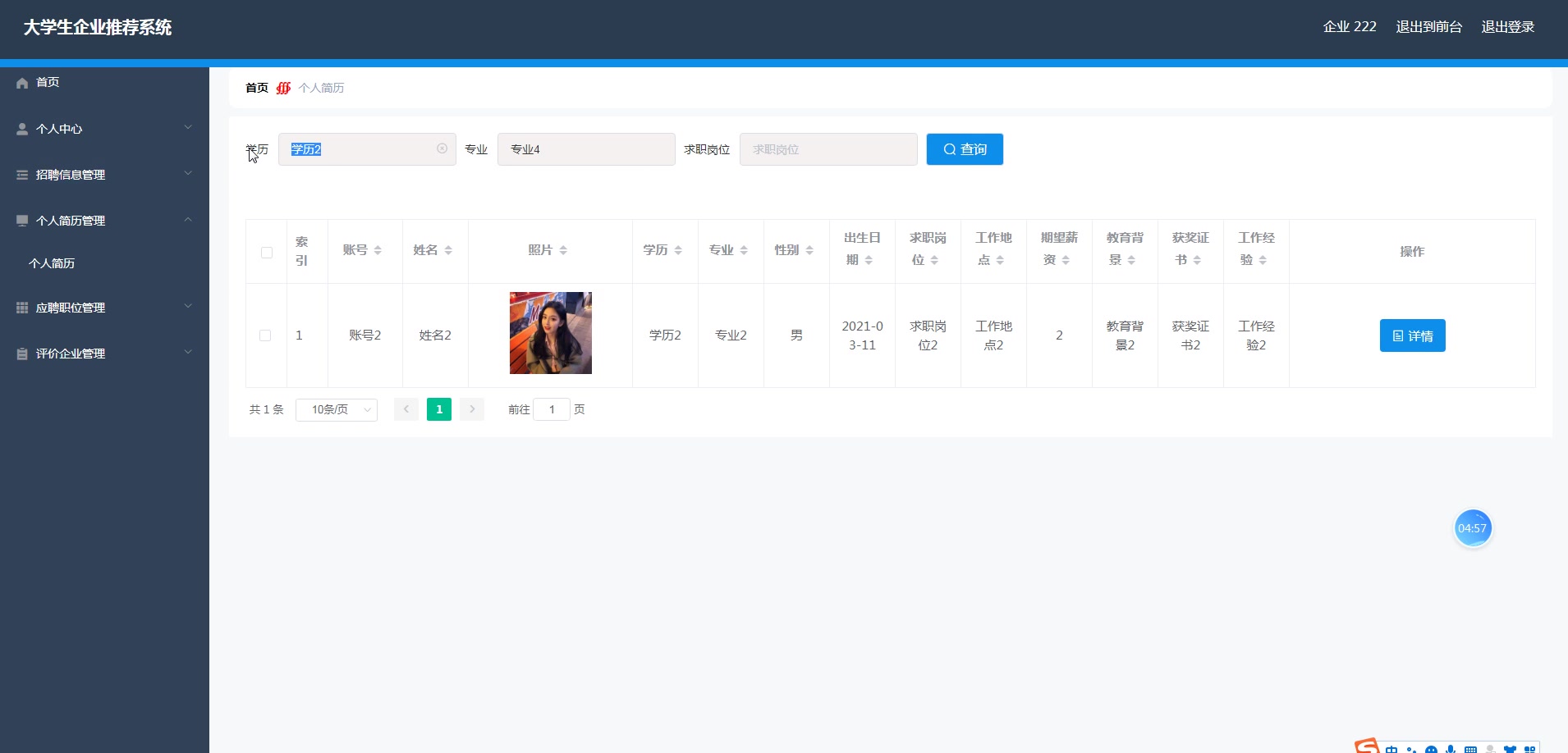 大学生企业推荐系统采用b/s结构、java开发语言、以及mysql数据库等技术。系统主要分为管理员和学生、企业三部分,管理员主要功能包括:首页、个人中心、学生管理、企业管理、招聘信息管理、个人简历管理、应聘职位管理、评价企业管理、交流论坛、系统管理,学生;首页、个人中心、招聘信息管理、个人简历管理、应聘职位管理、评价企业管理,企业;首页、个人中心、招聘信息管理、个人简历管理、应聘职位管理、评价企业管理,前台首页;首页、招聘信息、个人简历、交流论坛、个人中心、后台管理等功能,基本上实现了整个大学生企业推荐系统信息管理的过程。本系统在一般大学生企业推荐系统的基础上增加了最新信息的功能方便学生快速浏览,是一个高效的、动态的、相互友好的大学生企业推荐系统。