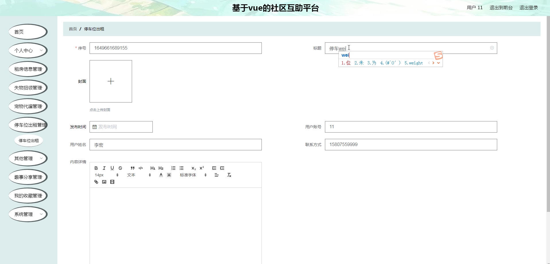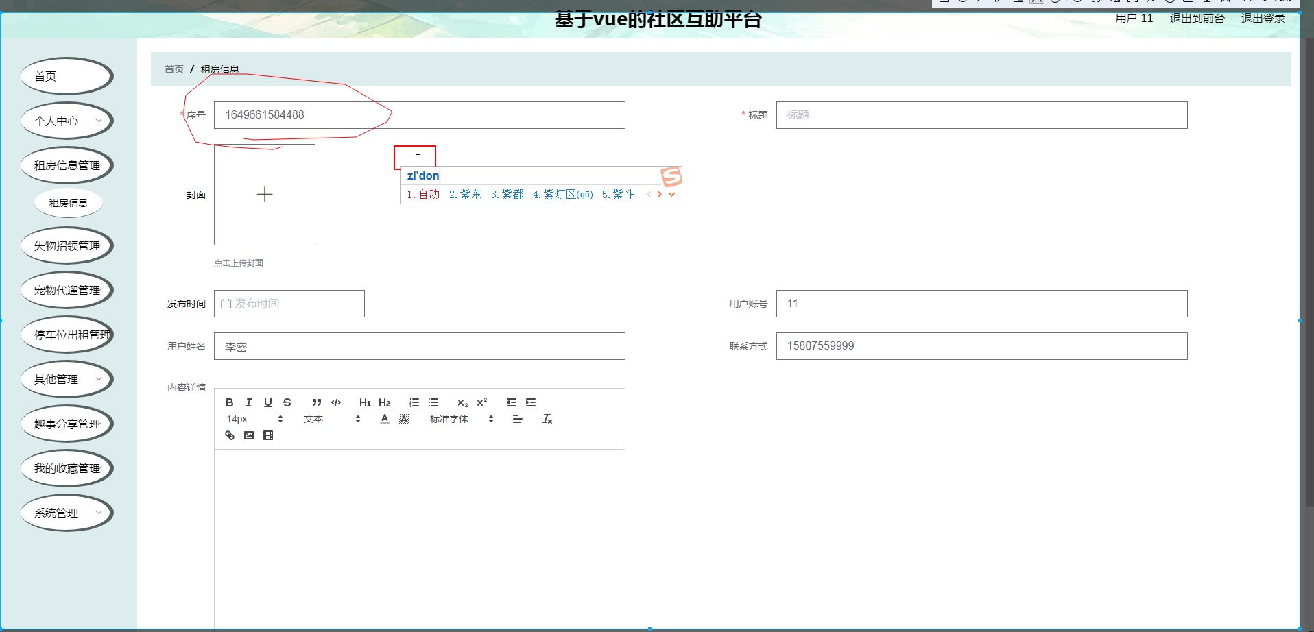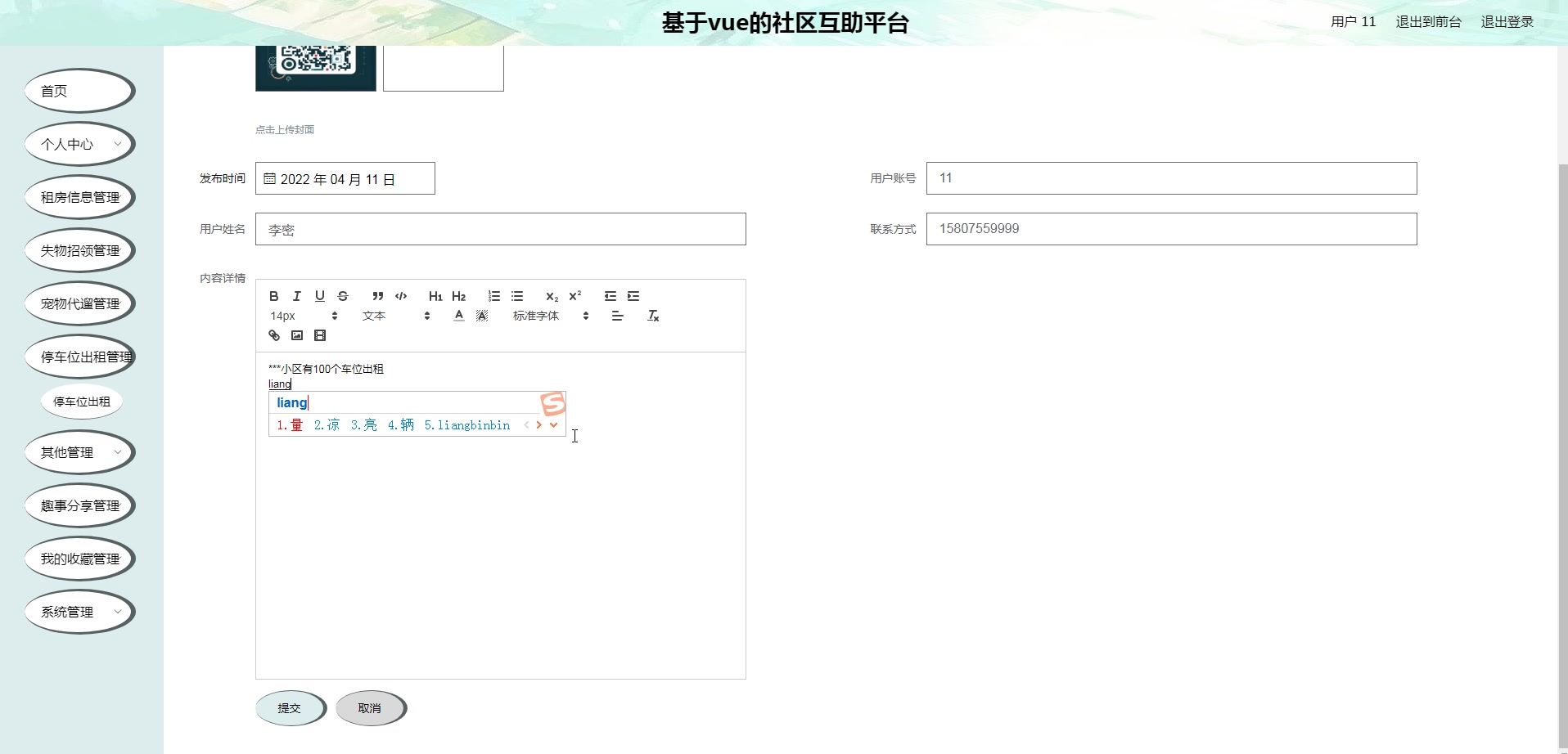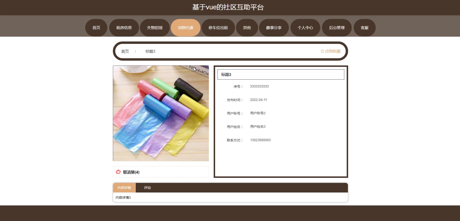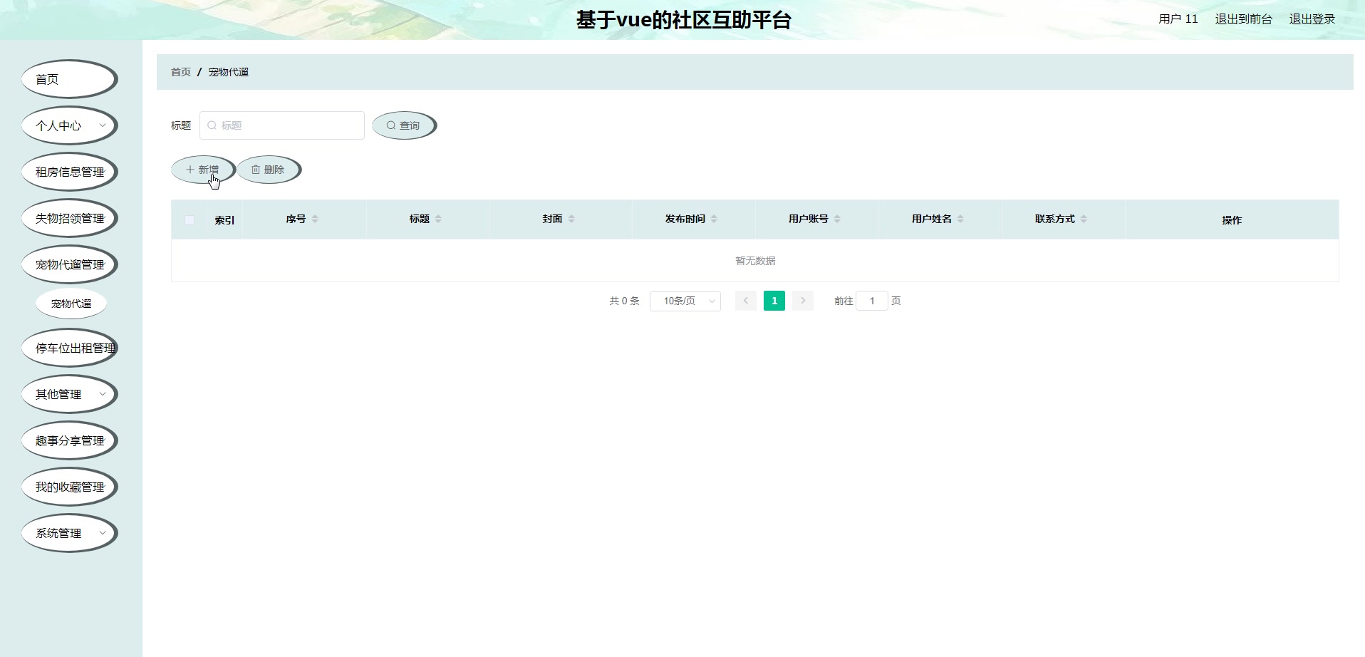 - 信息管理(租房、失物招领、宠物代遛、停车位出租等审核/删除)