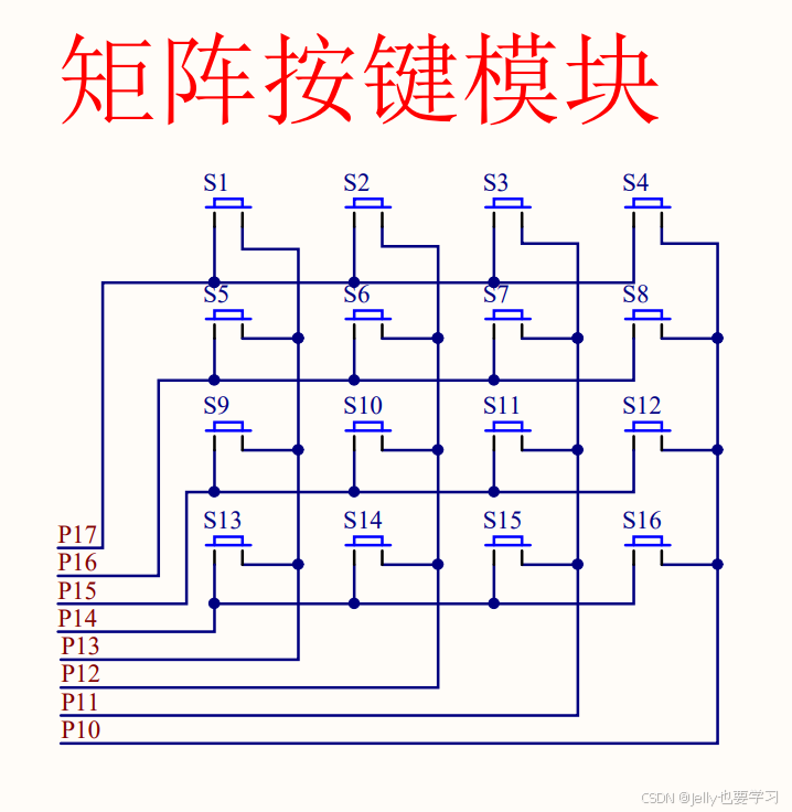矩阵键盘的好处:在键盘中按键的数量比较多的时候,为了减少IO口的占用,通常采用按键排列,就像矩阵键盘这种形式,采用逐行扫描或者住逐列扫描就可以读取按键的状态