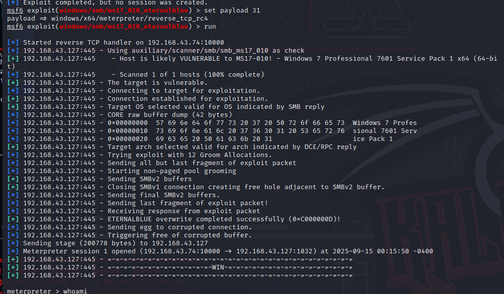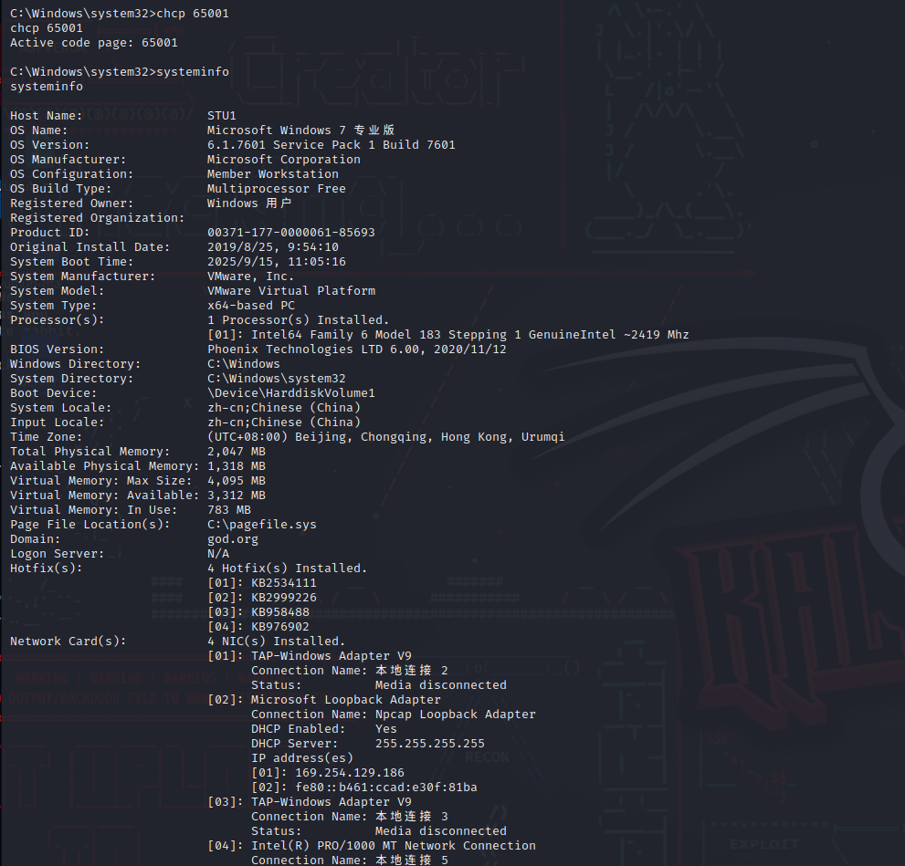 看见下方的win表示成功打进win7进入session,此时我们就可以执行一些后渗透操作了,我把操作贴在下面就不一一展示了。