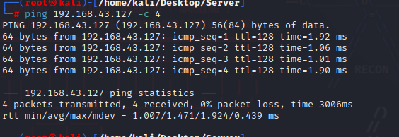 注意这里我们的ping命令要加上-c参数去限制一个ping的次数,如果不加这个参数的话kali将会一直给win7发包,这里我的命令是-c 4表示只发四次。