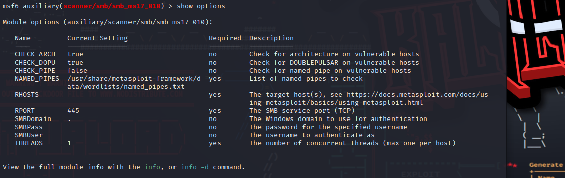 我们先使用编号为3的模块执行一个漏洞的扫描,输入use 3,然后再输入show options来看一下使用该模块要设置什么参数。